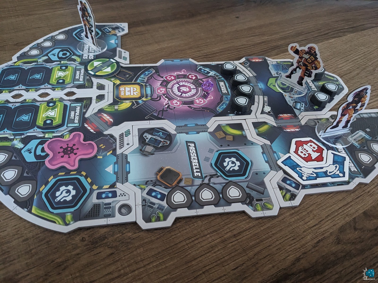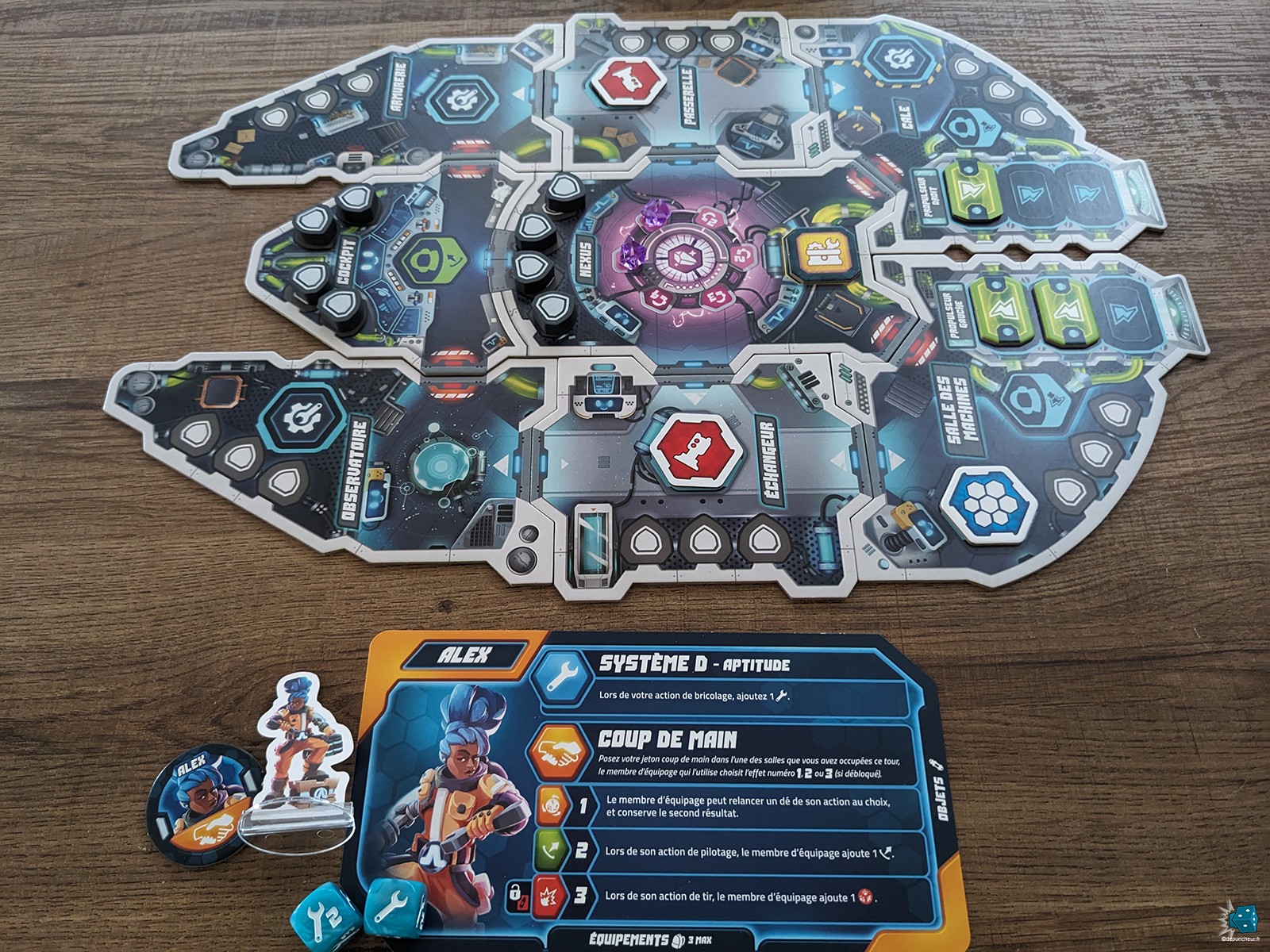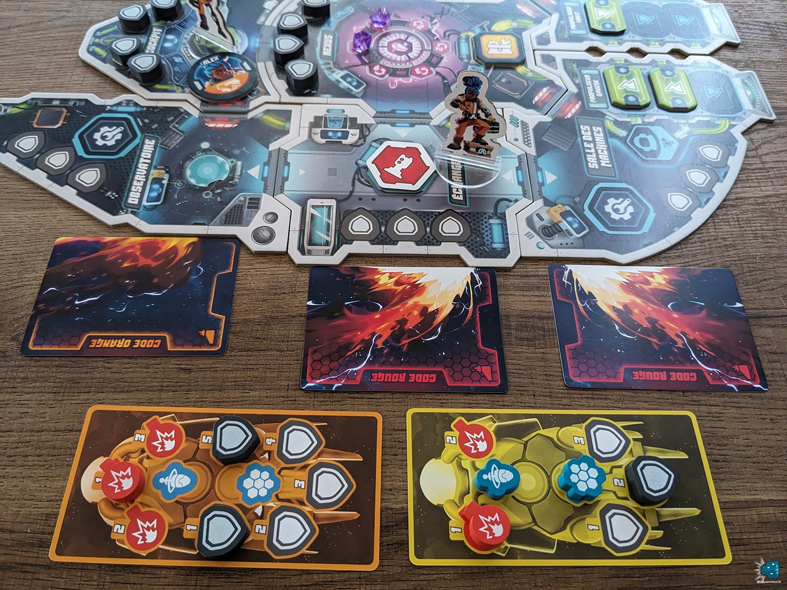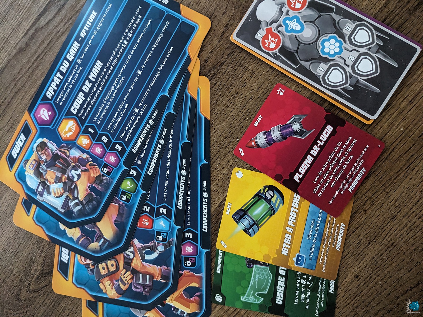 C’est devenu un standard dans le jeu de société moderne, mais ici encore, le matériel est d’une qualité irréprochable : cartons épais pour les modules du vaisseau, jetons solides pour les blindages, cristaux translucides en guise de monnaie et des cartes à la finition impeccable. Tout est clair, net, agréable en main et surtout, extrêmement fonctionnel. Mention spéciale au thermoformage : chaque élément trouve sa place naturellement dans un rangement à la fois pratique et élégant. J’ai déjà vu des inserts vendus séparément bien moins optimisés que cette boîte de base. Chapeau bas à Arkada Studio.