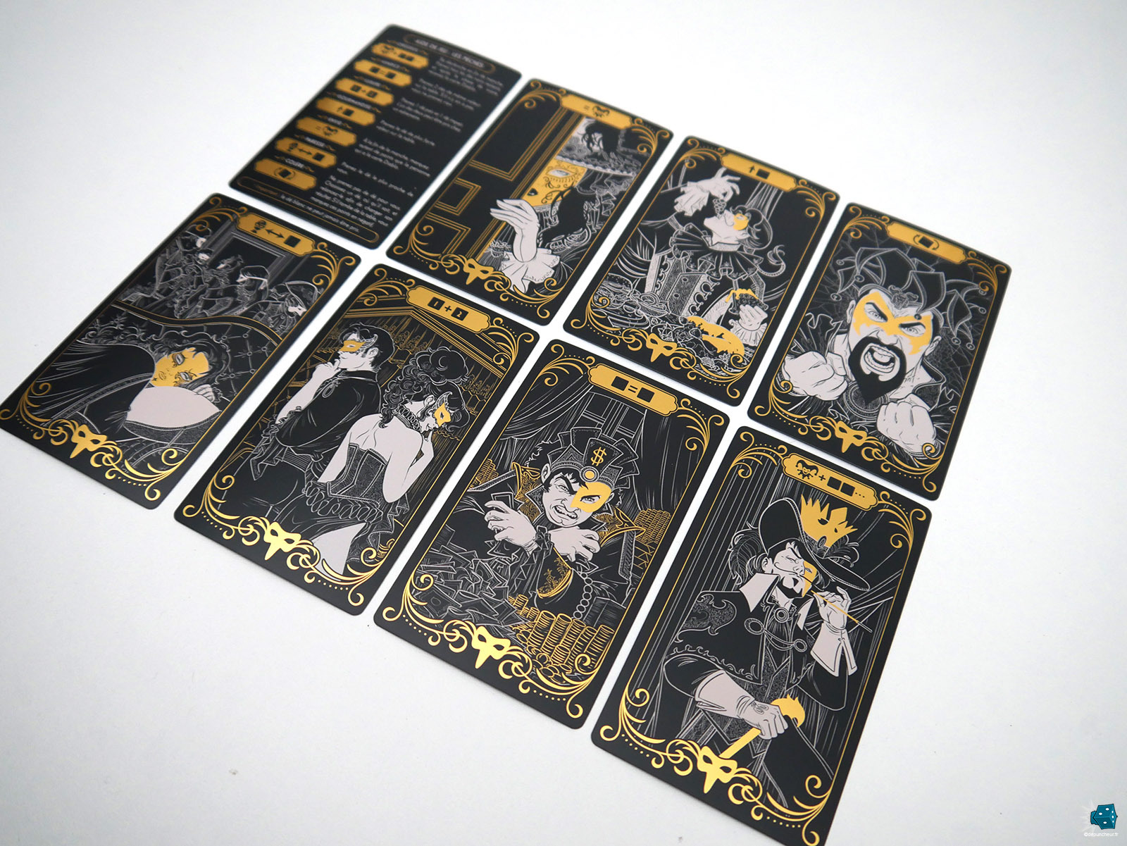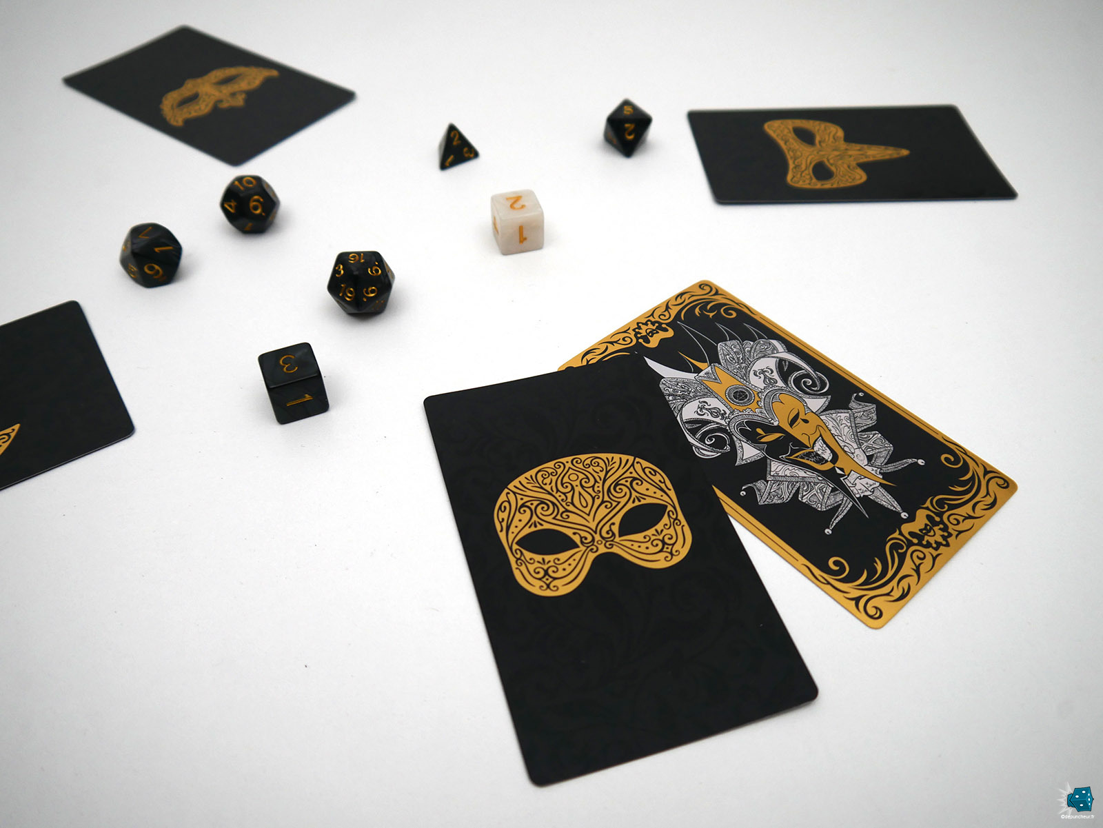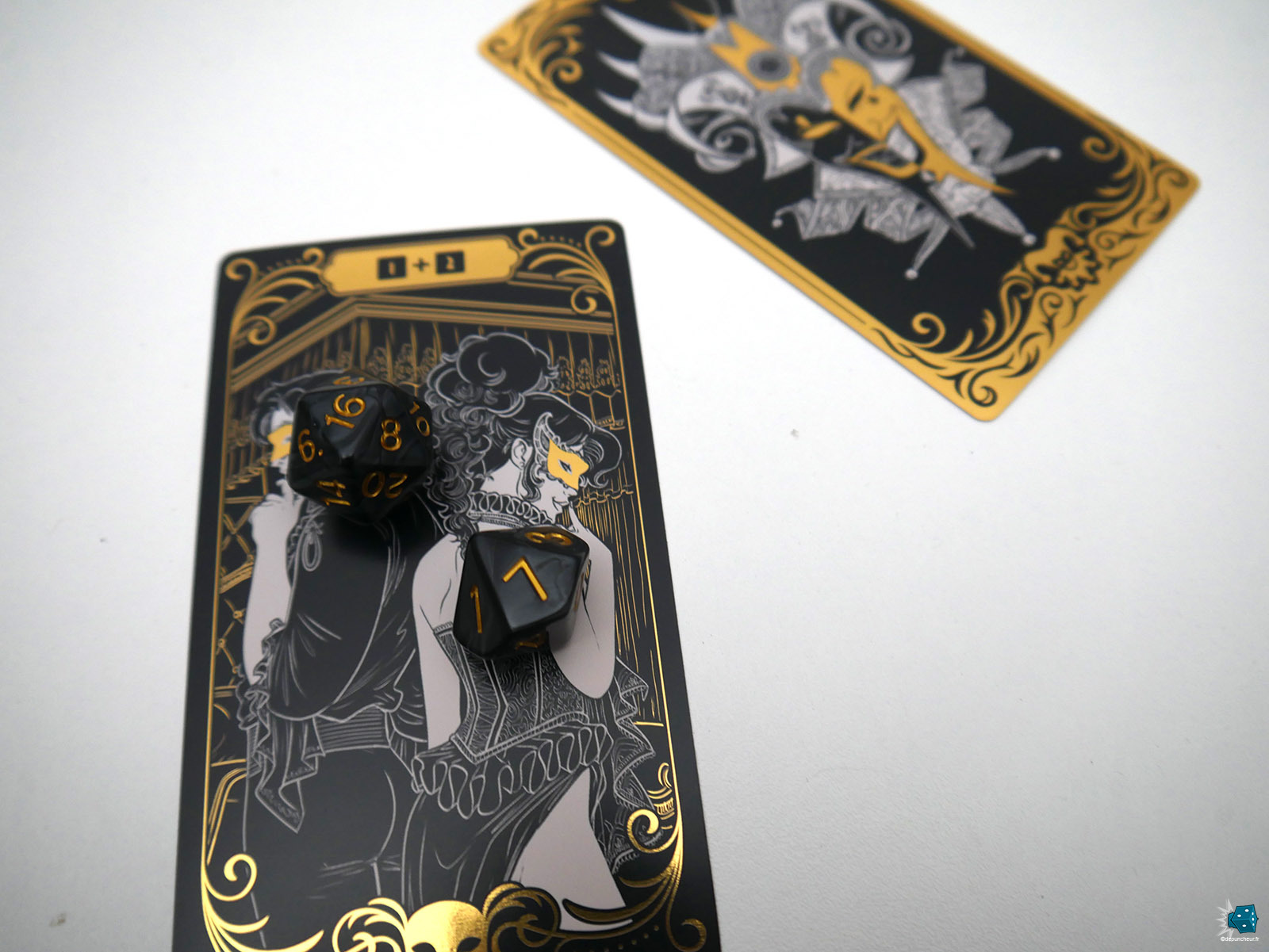 Le travail de la carte est fabuleux, des illustrations somptueuses aux dorures et vernis dignes des grandes maisons parigotes. On pourra par contre frémir que les inscriptions des dés s'effacent avant la barre fatidique des 12 lancers cumulés, mais une aussi jolie collection de dés pour ce prix, c'est quand même un gros kiff. Et le tout prend place dans une boite incroyable que ne renierait pas Dior / Chanel / Louis Vuitton / Ikea (ne gardez que la marque que vous envoie le plus d'étoiles dans les yeux), pour un effet au déballage assuré.