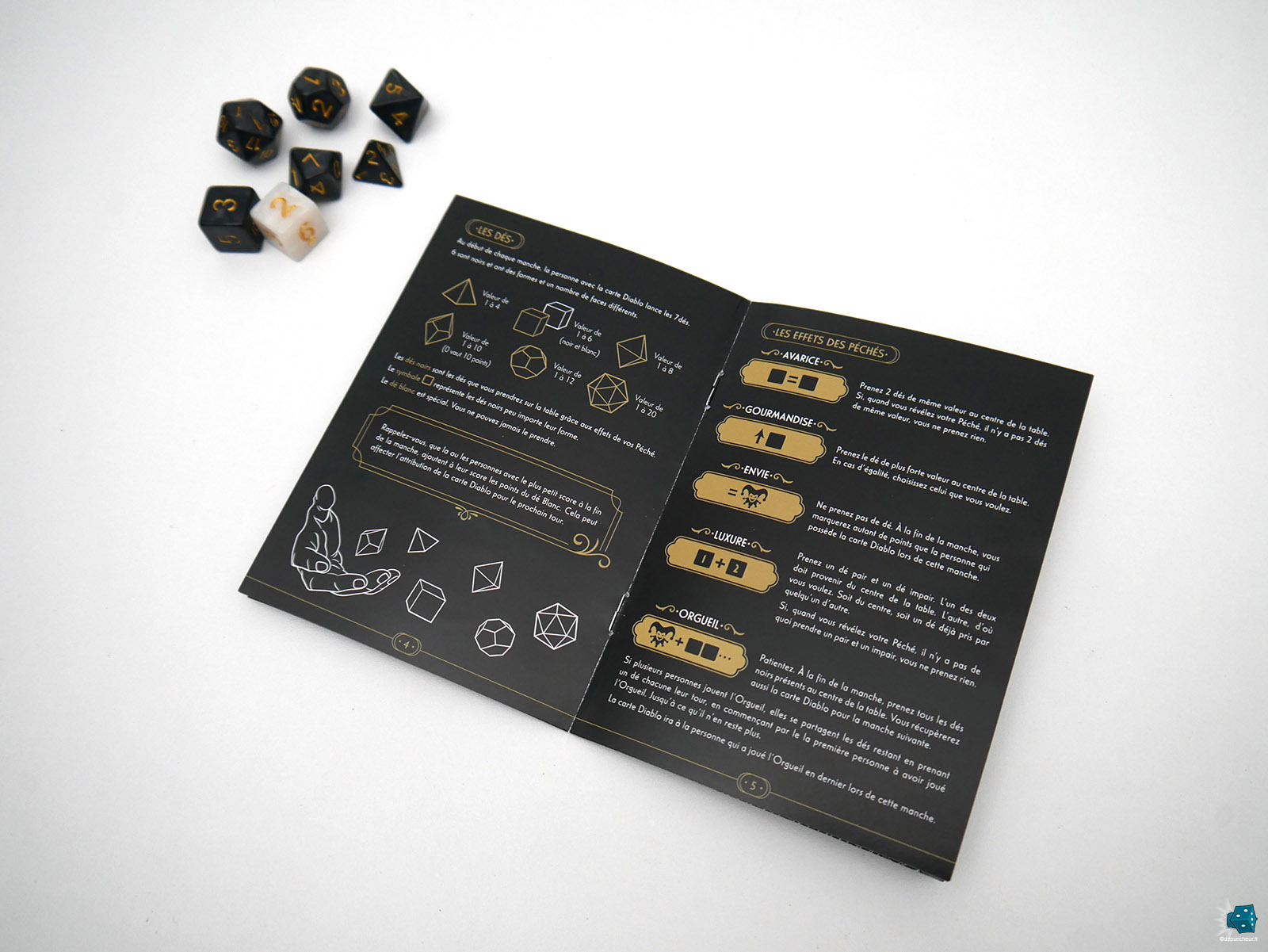 Dans tous les cas, il faut savoir, primo, que le dé blanc ne peut jamais être pris et est seulement comptabilisé que par celui ou ceux empochant le moins de points après le décompte de ladite manche. Deuxio, que les joueurs débutent tous la partie avec la même main de 7 cartes (représentant chacune l'un des 7 péchés capitaux), et ne peuvent récupérer aucune des cartes jouées lors des manches précédentes !