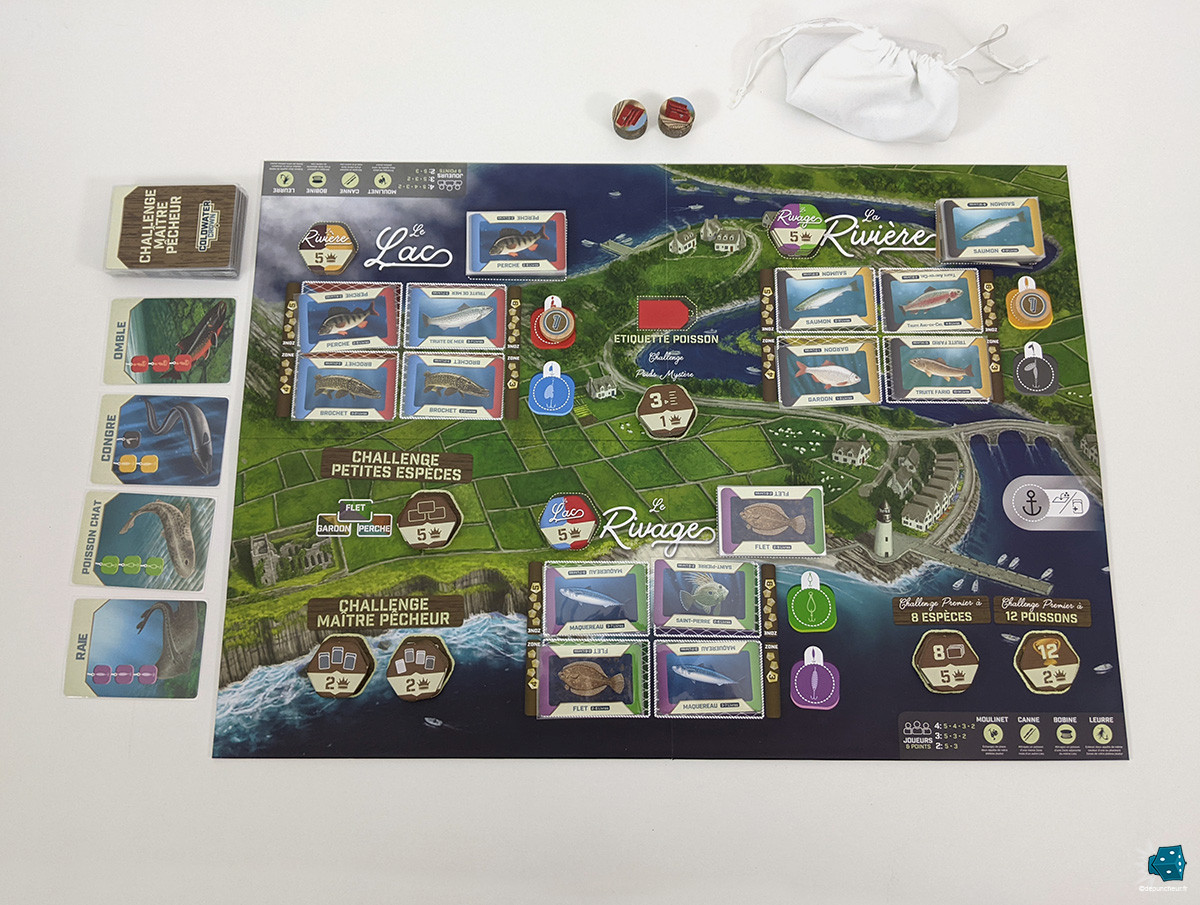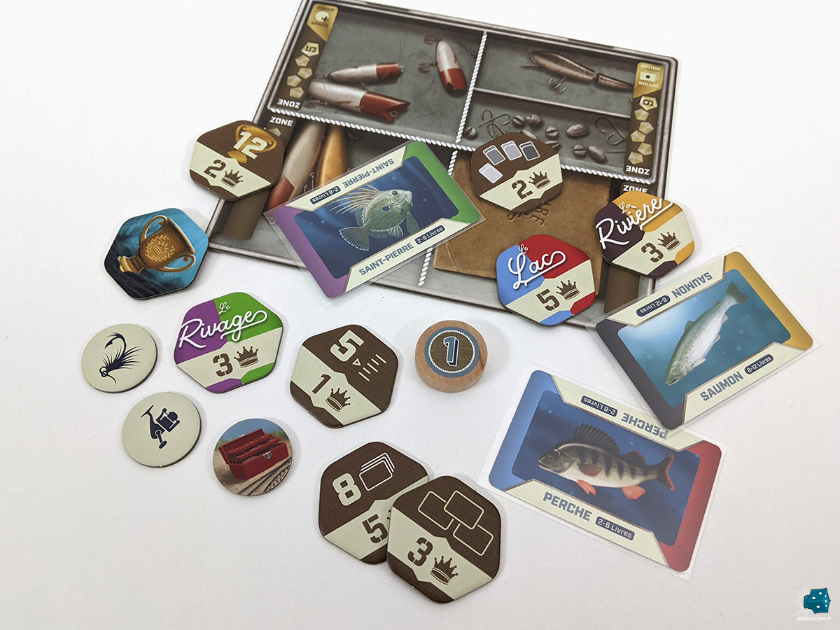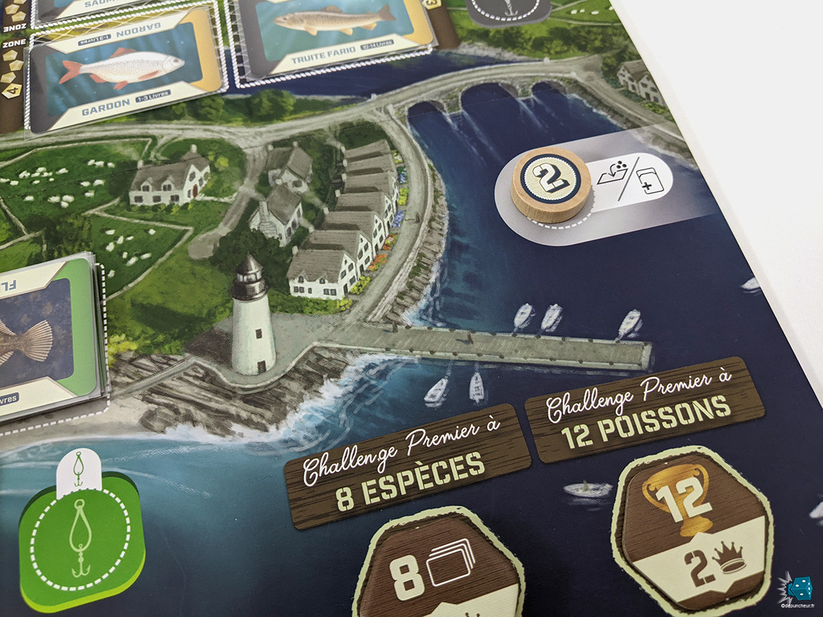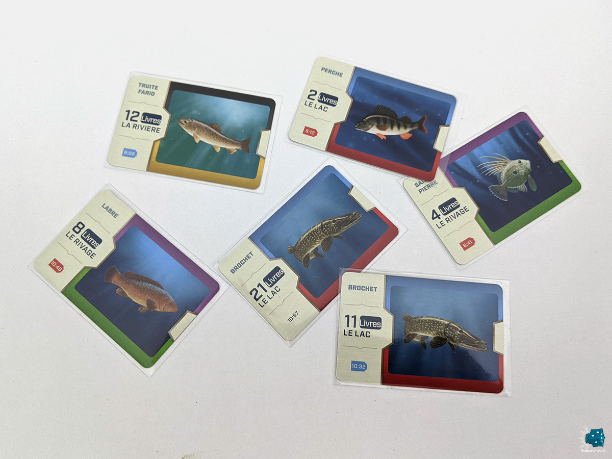 Cependant, durant la partie, vous aurez de nombreuses occasions de rajouter des points à votre scoring final en grapillant un maximum des trophées en jeu, allant de récupérer un poisson de chacune des trois mini-espèces (gardon, perche et flet) à compléter trois cartes identiques du challenge Maître pêcheur, en passant par récupérer 12 poissons d'espèces différentes (ce qui déclenche d'ailleurs la fin de partie).