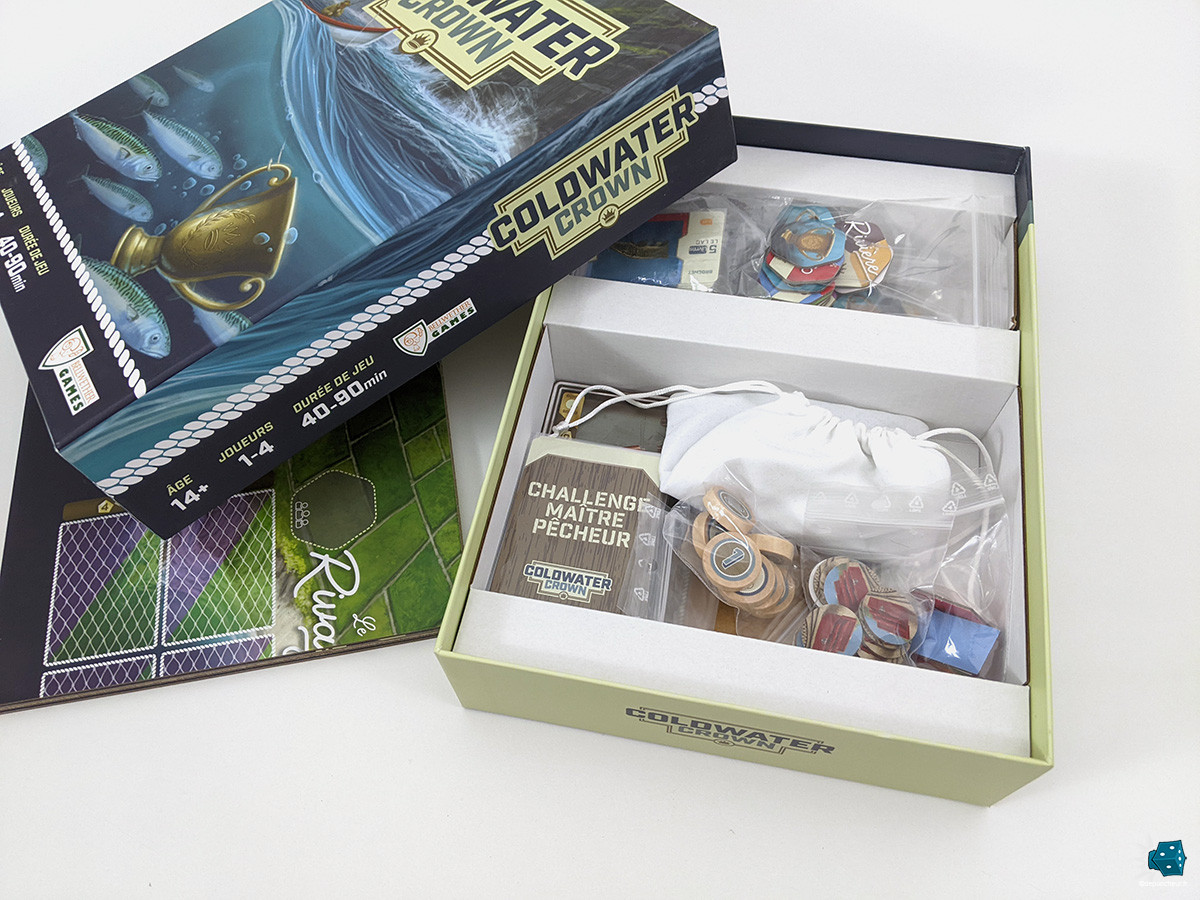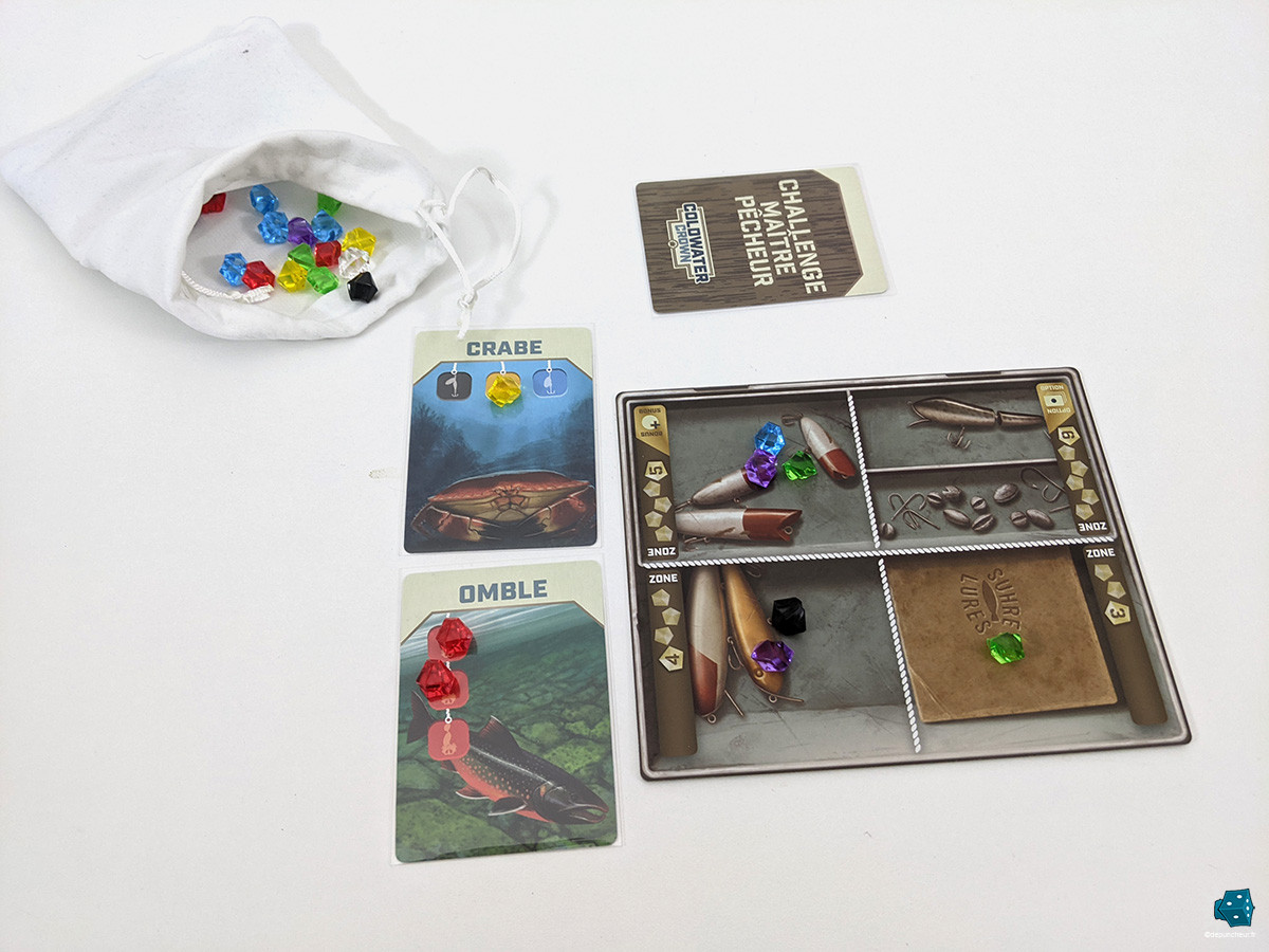 Certains de ces trophées se jouent à la rapidité (jeton unique ou points dégressifs), alors que d'autres vous offrent un nombre de points fixe dès que vous réussissez l'objectif. Coldwater Crown rajoute un peu de hasard à l'ensemble en incluant un système de récompense pour celui qui pèchera un poisson du poids indiqué par le jeton le plus haut d'une pile.