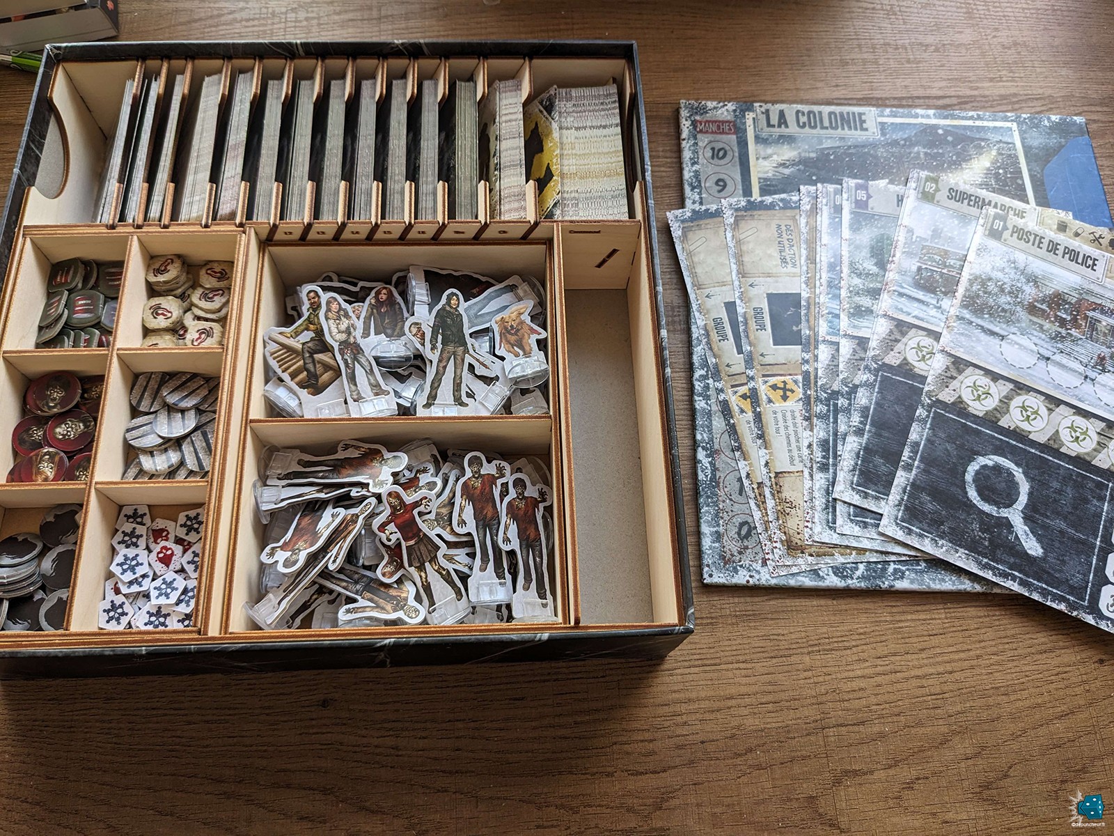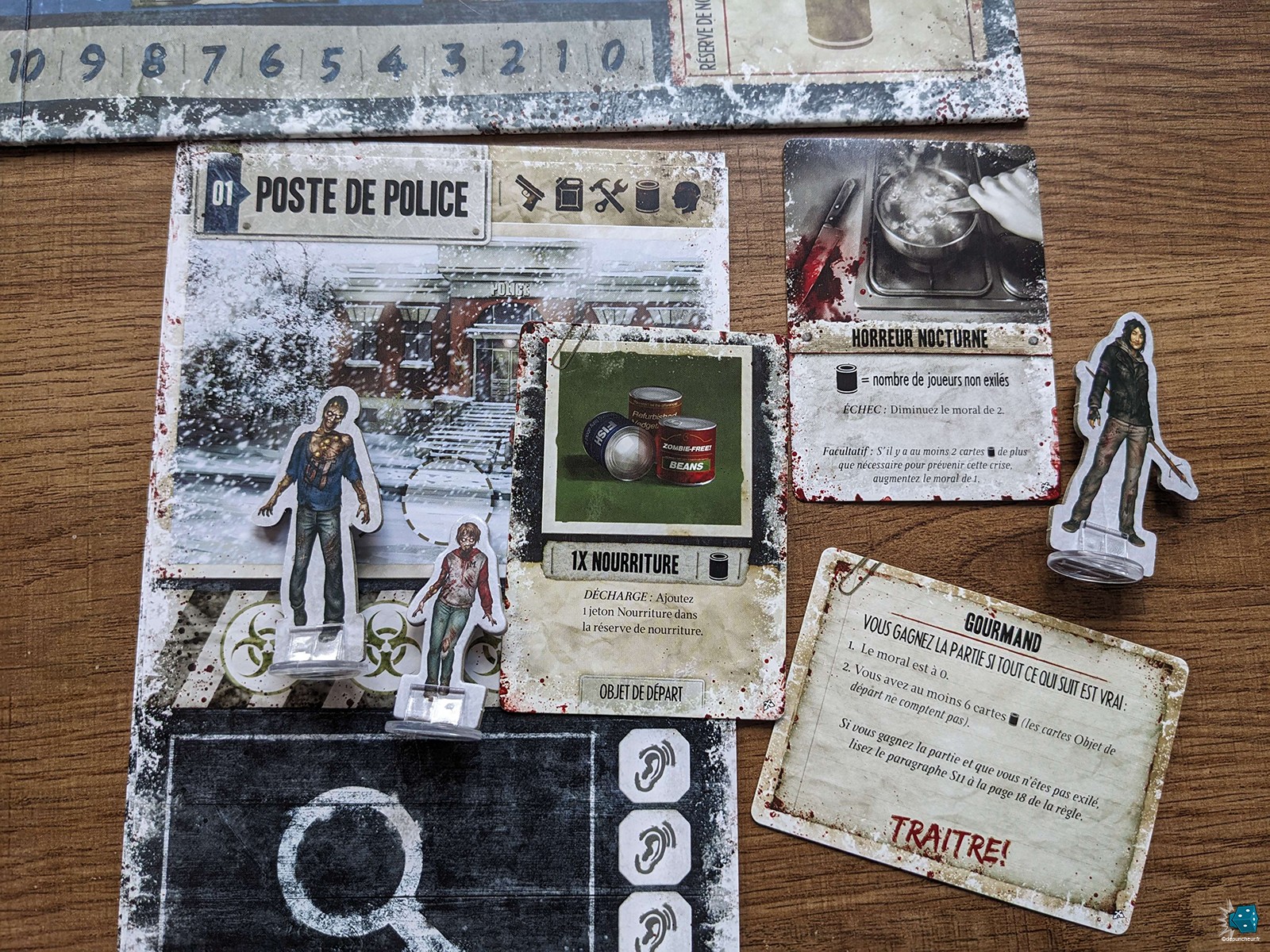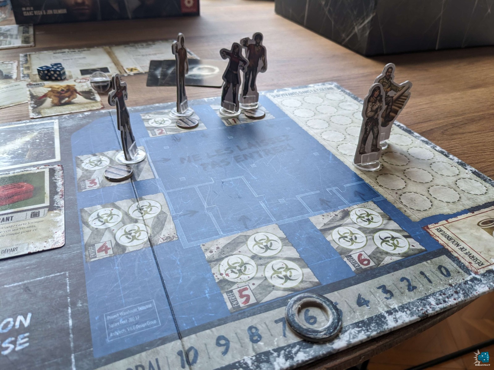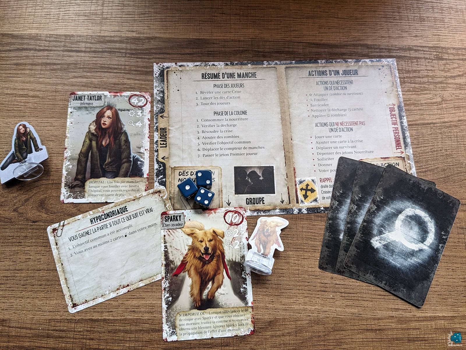 La qualité de l’édition est également au rendez-vous, avec des figurines et des tokens en cartons double couches aussi bien agréables à l’œil qu’au toucher. Les illustrations et leur style « comic book US » collent parfaitement au thème général et devraient ravir les survivalistes de tout âge. Après 11 ans d’utilisation, je reste impressionné par la robustesse du matériel : cartes, socles et lieux sont toujours en excellent état malgré de très nombreuses parties. Quand bien même je n’aurai pas craché sur des ressources en bois, le prix reste cohérent avec la quantité et la qualité du contenu proposé.