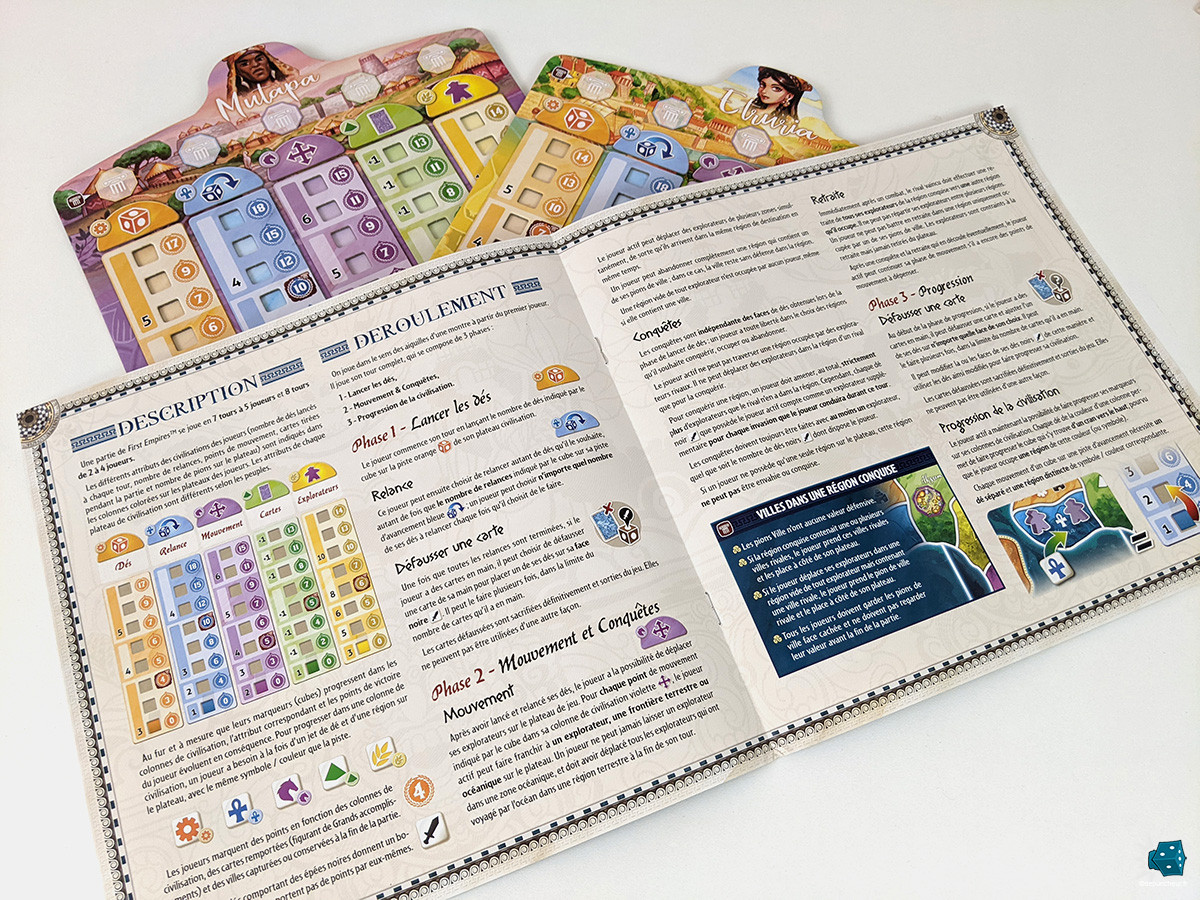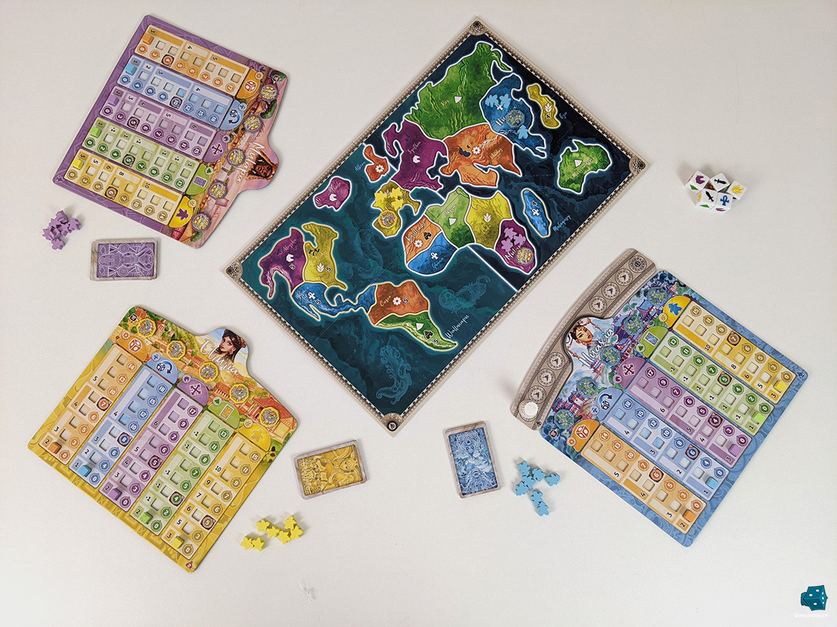 Chaque joueur débute une partie avec une ville, un emplacement précis sur une carte du monde commune, et un plateau personnel où ses cinq curseurs d'évolution sont au minimum syndical. Nombre de dés à lancer, relances, déplacements, cartes objectifs en main et unités sur la carte sont les attributs que vous allez pouvoir faire évoluer durant la partie pour que chacun de vos tours soit beaucoup plus riche en possibilités que les précédents.