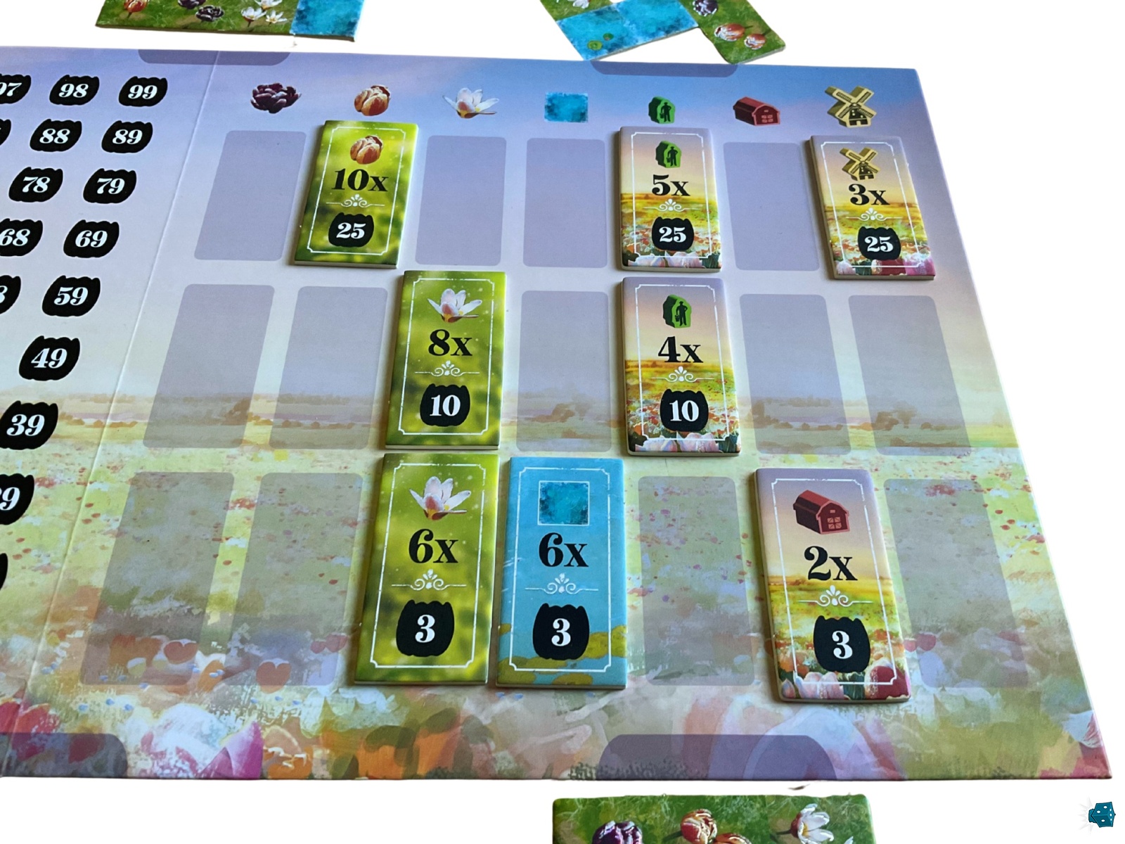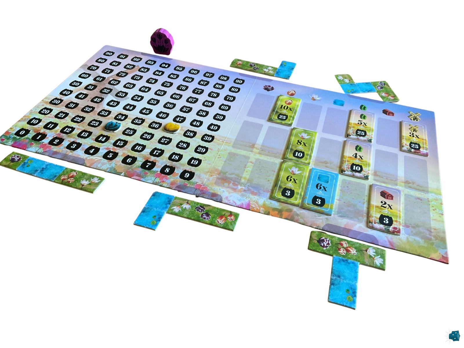 Enfin, n’oubliez pas de surveiller les objectifs du plateau central, classés par familles (eau, couleurs des tulipes, bâtiments, etc.). Vous pouvez en réclamer un par tour dès que les conditions sont remplies grâce à la tuile que vous venez de poser. Mais attention : une fois un objectif récupéré, vous ne pourrez plus en revendiquer d'autres de la même catégorie. Il sera donc parfois judicieux de se priver d’un objectif facile pour en viser un plus ambitieux, au risque qu’un adversaire ne vous le fauche sous le nez.