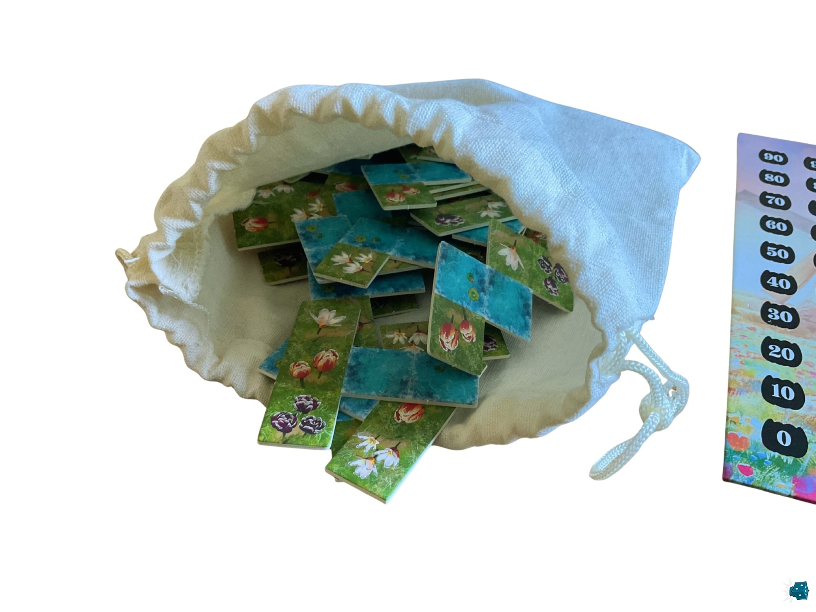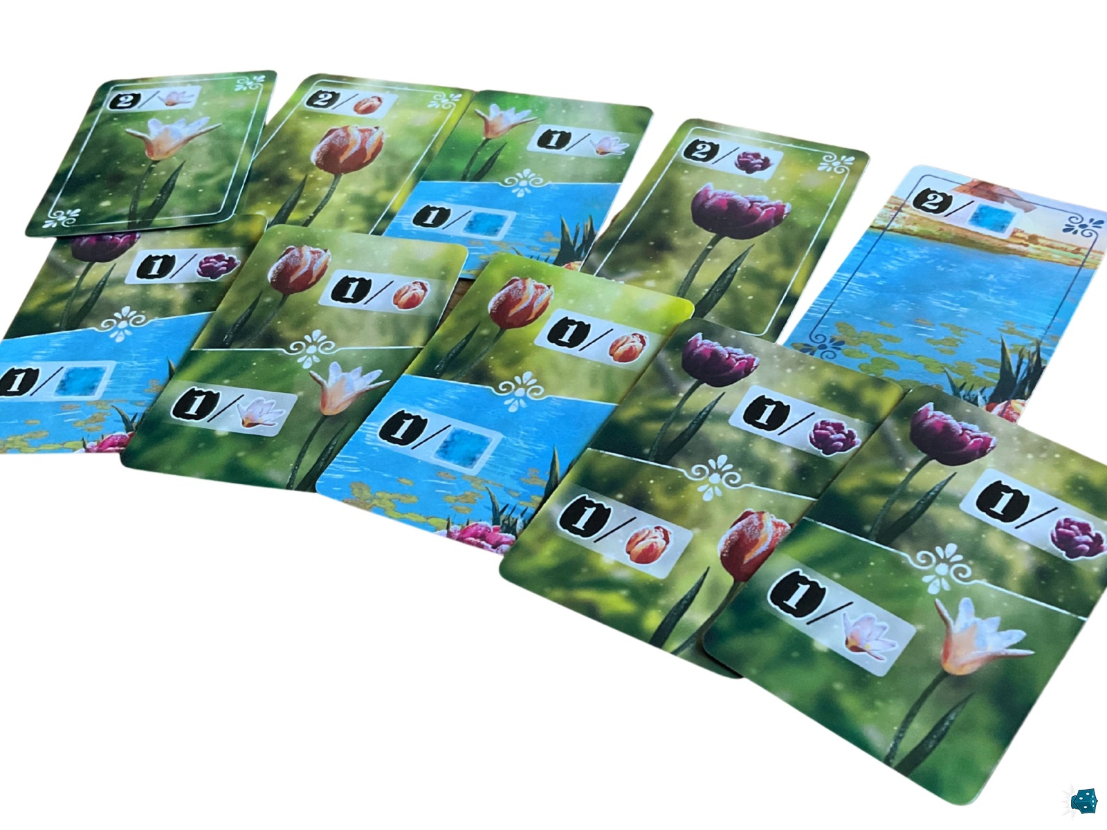 C'est alors que les cartes entrent en scène pour marquer des points : parmi les trois en main, vous devez jouer celle que vous jugez la plus intéressante. Chacune possède une ou deux conditions de scoring à appliquer immédiatement. Ainsi, si vous jouez une carte qui score sur les cases d’eau ou les tulipes noires, il vous suffira de comptabiliser ces éléments sur la tuile posée et ses voisines directes, avant de reporter le score sur le plateau central. La carte est ensuite défaussée pour le reste de la partie.