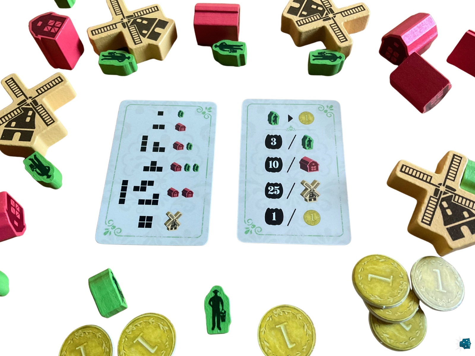 Il faut dire aussi que le matos en jette et contribue à donner envie de ressortir régulièrement le jeu. Entre ces gros moulins qui viennent narguer les champs de vos voisins avec ses ailes jaunes, ces granges rouge vif et ces petits jardiniers verts qui arrosent vos champs, vous aurez tôt fait de vouloir créer le plus possible d’espaces vides pour accueillir tout ce beau monde dans votre jardin qui brille. Car oui toutes les tuiles du jeu sont, à l’instar de l’illustration un brin kitsch de la boîte, recouvertes de discrètes lignes de vernis brillant pour simuler la rosée du matin ! Et, si on peut rester dubitatif face à cette tendance récente du foil dans le monde du jds, y a pas à dire : une fois le jeu déployé sur la table, ça claque !