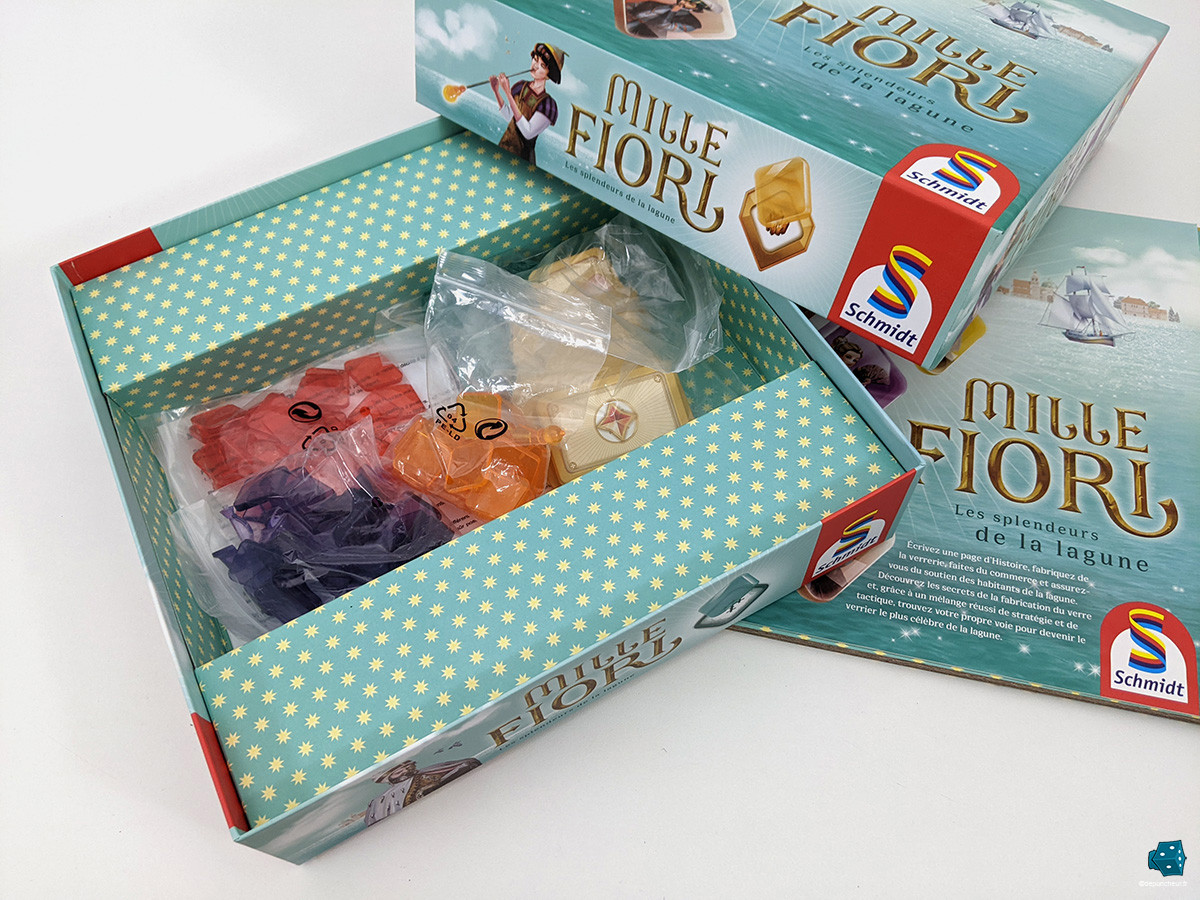 Mille Fiori (le jeu ciblé dans les lignes à venir) a pourtant des qualités intrinsèques à revendre, comme une signature qui attire l'œil (Reiner Knizia), une boîte d'un bleu étincelant qui renferme une abondance de petites pièces semi-transparentes agréables à regarder et à manipuler, et un plateau ultra coloré qui sent bon le petit jeu combinatoire des familles.
