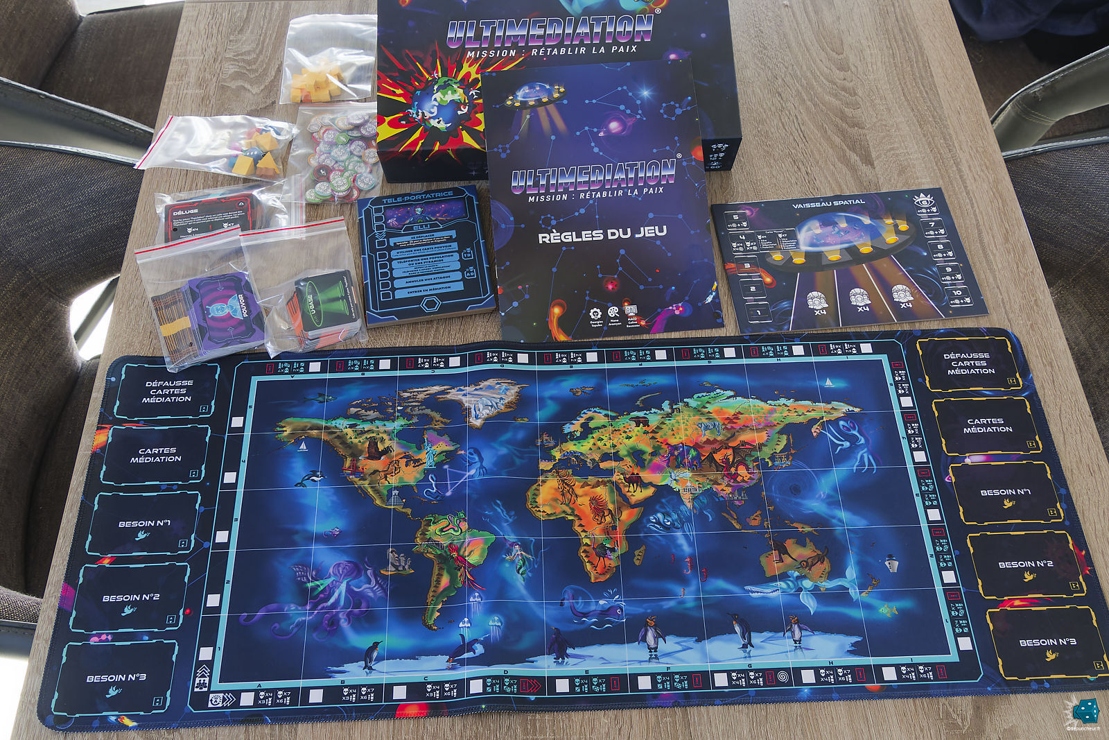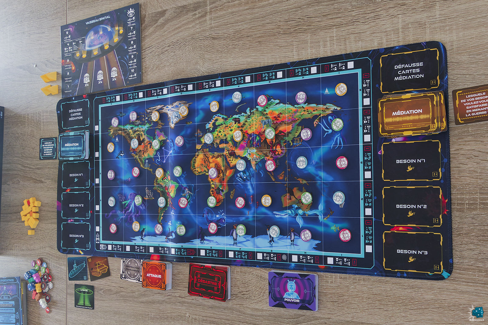 Dès l’ouverture de la boîte, Ultimediation impose son identité visuelle. Le plateau principal, représentant une carte du monde stylisée et foisonnante de détails, occupe une place centrale sur la table. Autour de lui viennent se greffer de nombreux emplacements dédiés aux cartes Médiation, Besoins, Attaques, Désastres ou encore Pouvoirs, donnant immédiatement le sentiment d’un jeu dense et très structuré.