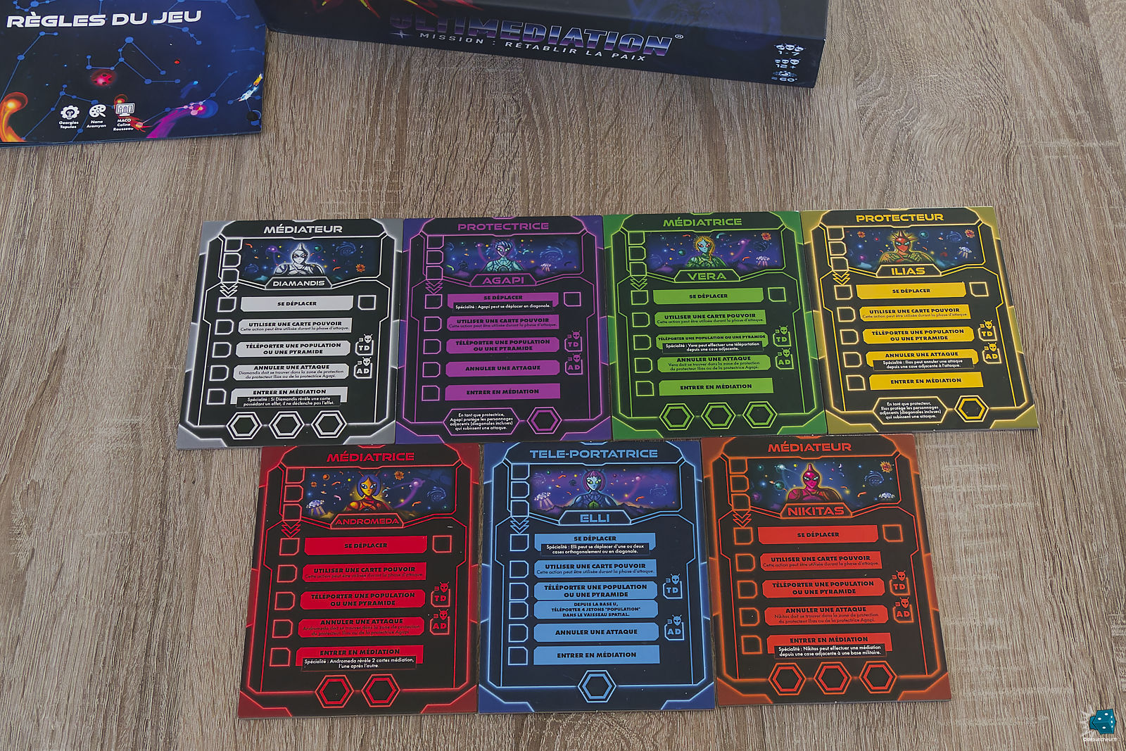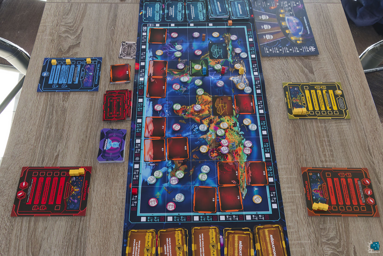 Les personnages jouables — médiateurs, médiatrices, protecteurs, télé-portatrice — se distinguent clairement par leurs couleurs et leurs capacités spécifiques. Chacun dispose de son propre plateau individuel, lisible et bien pensé, qui résume efficacement les actions possibles et les pouvoirs spéciaux. Cette différenciation renforce l’asymétrie entre les rôles et pousse naturellement les joueurs à coopérer en exploitant les forces de chacun.