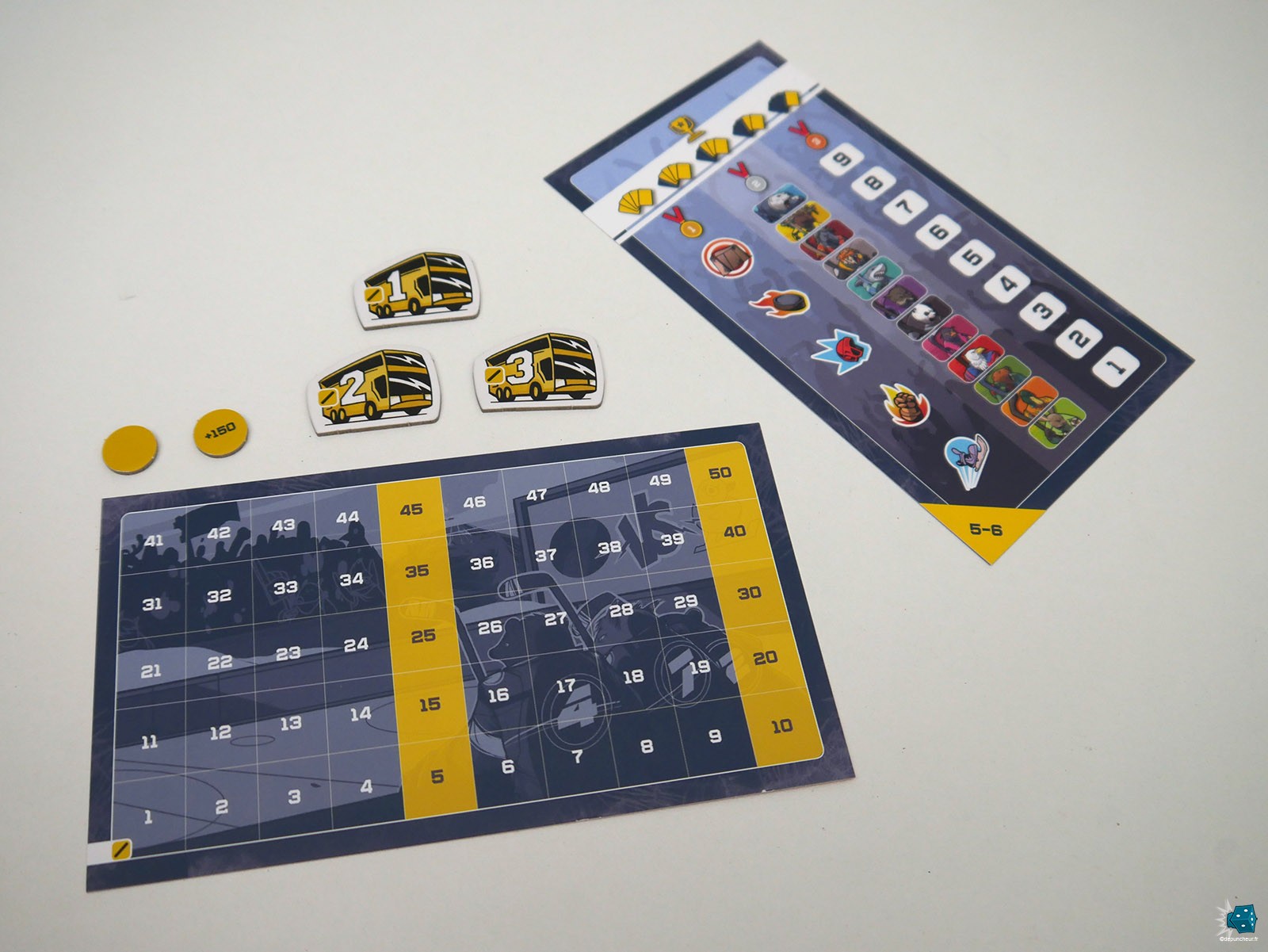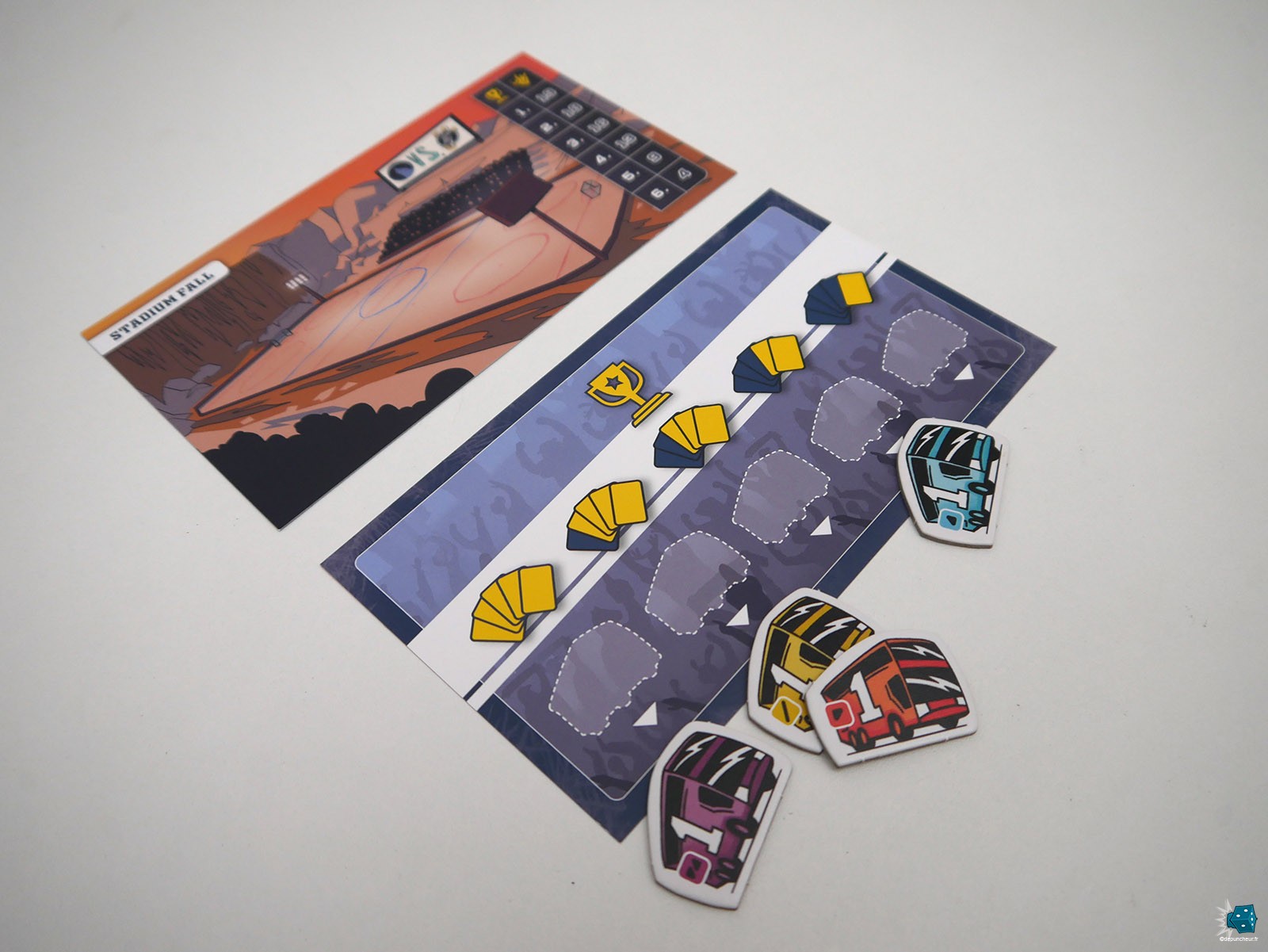 Le tri des cartes Joueur selon la configuration en est une (il n'aurait pas été compliqué à mon sens de mettre un 3+, 5+, ... dans un coin inférieur de carte). J'aurai aussi bien aimé que les arènes affichent leurs tableaux de scoring au moins dans deux sens de lecture (surtout qu'elles sont souvent au milieu de la table), ou que le plateau de résolution proposent des cases bus par "sous-catégories" (équipement, nombre, espèce) afin d'effectuer un premier tri bien utile lors du décompte des scorings intermédiaires !