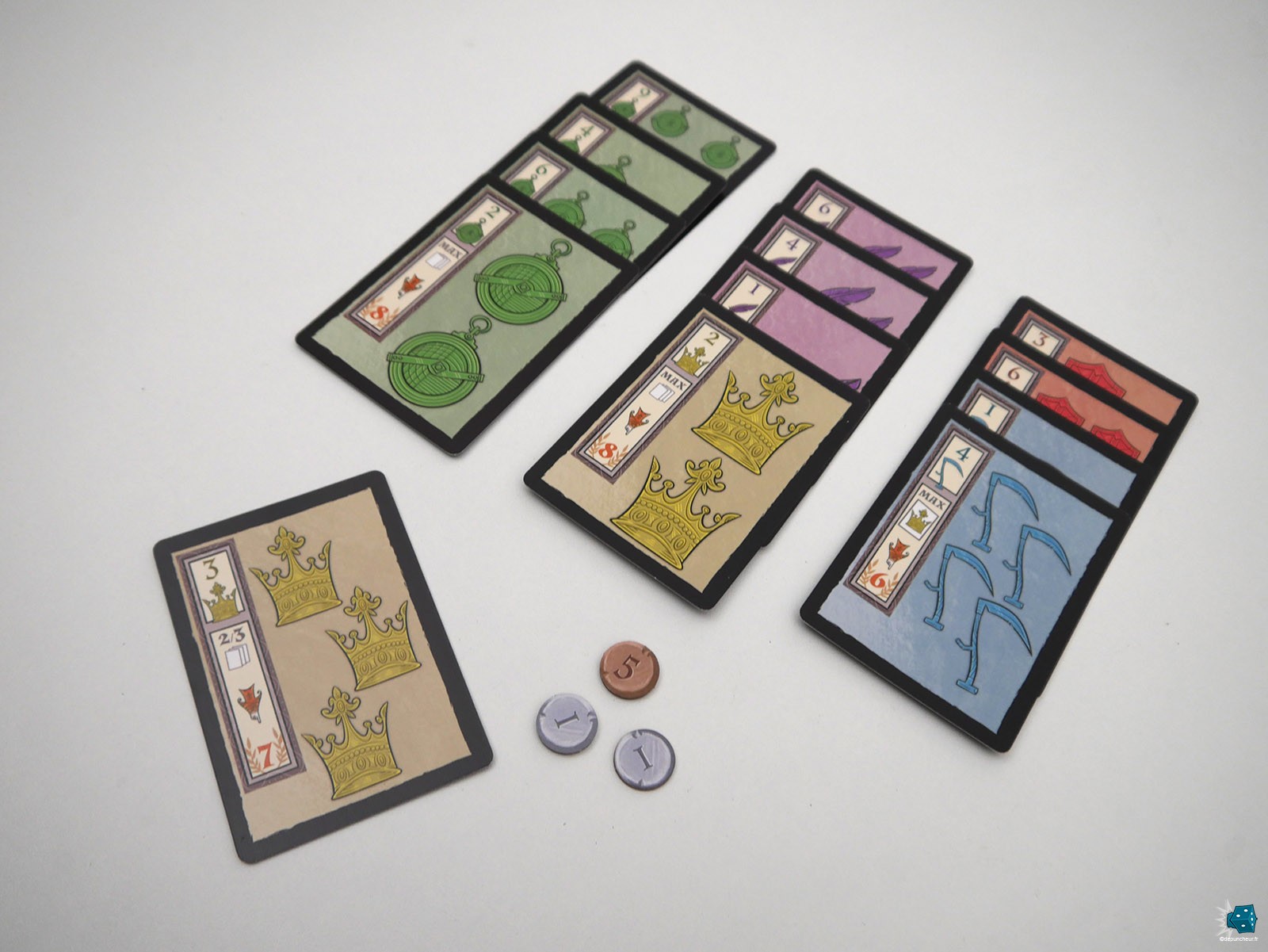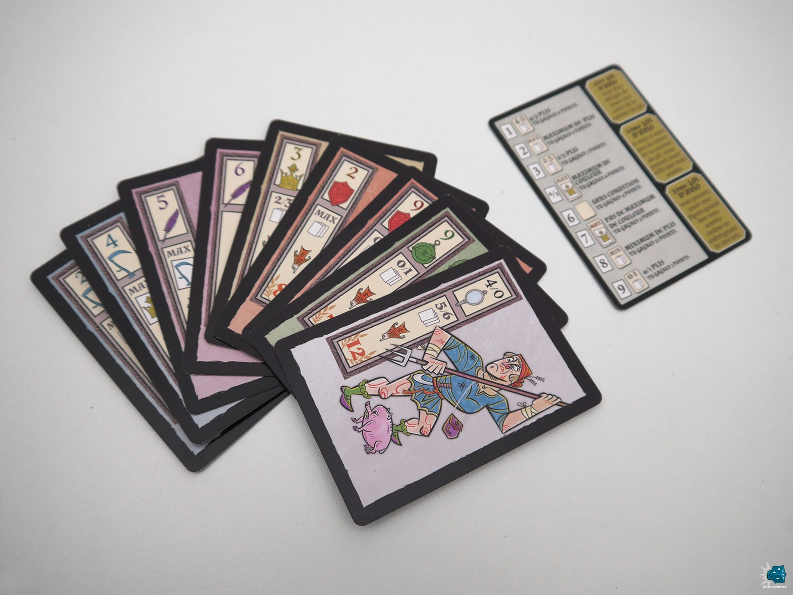 Et cela c'est sans parler de l'emplacement choisi, plutôt bas sur les cartes, qui nécessite d'écarter souvent les cartes dans sa main si on veut avoir une vision d'ensemble et prendre une décision réfléchie. Les petites mains pesteront, surtout durant les débuts de manche (quand on doit tenir 9 cartes en main). Et certains rageront de voir qu'en 2025, il existe encore des jeux que l'on ne peut tenir en éventail que dans un seul sens.
