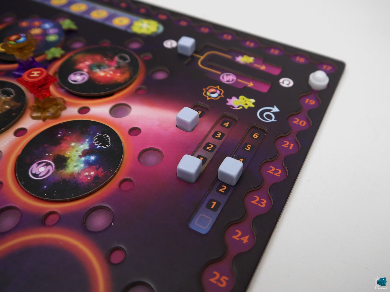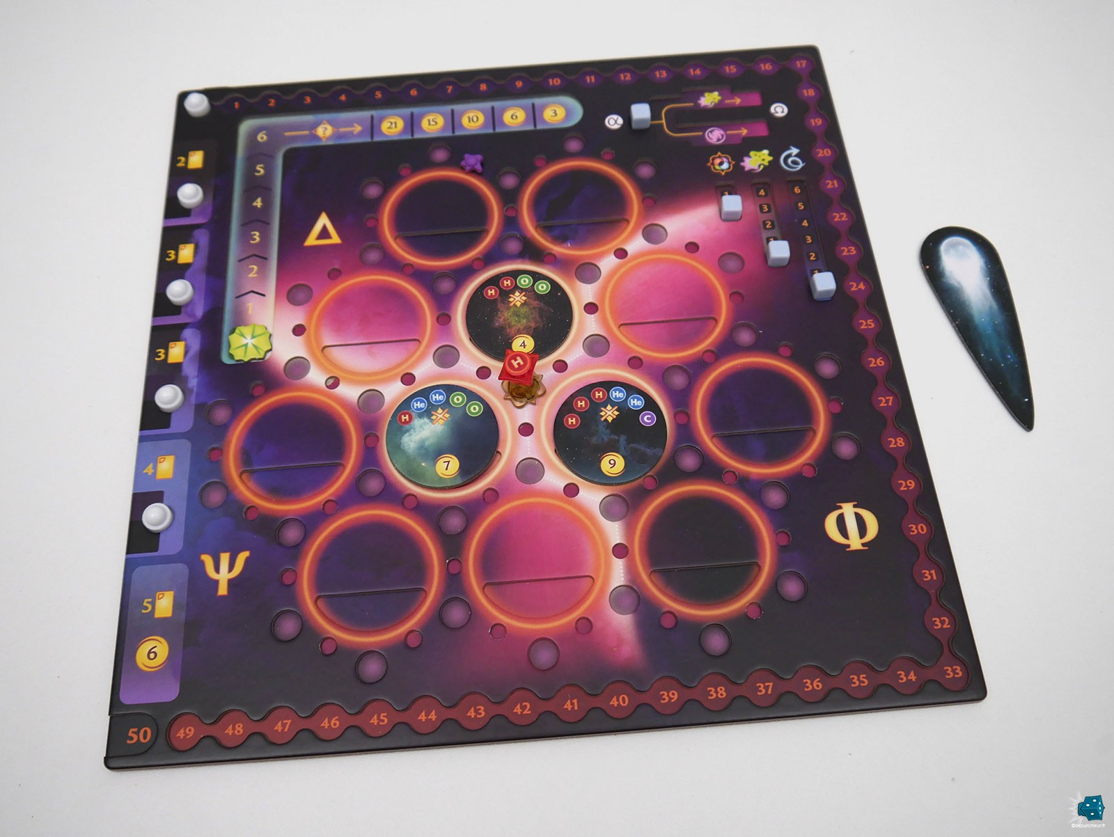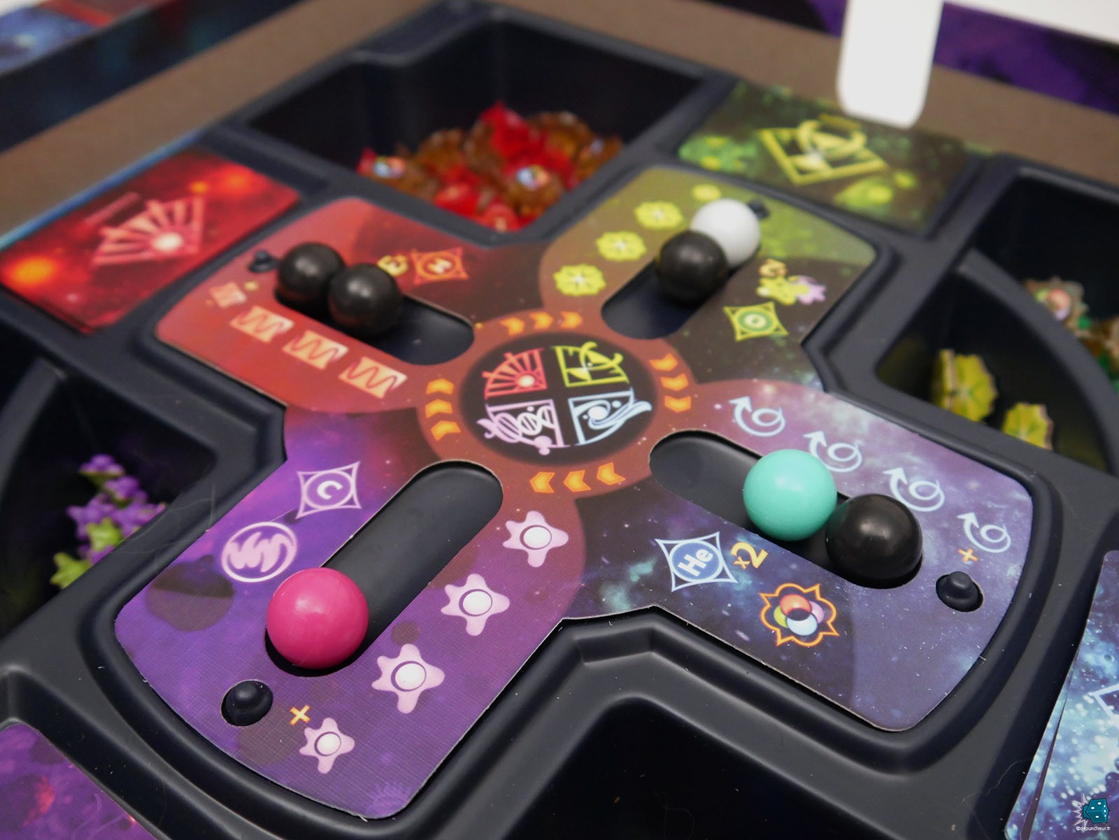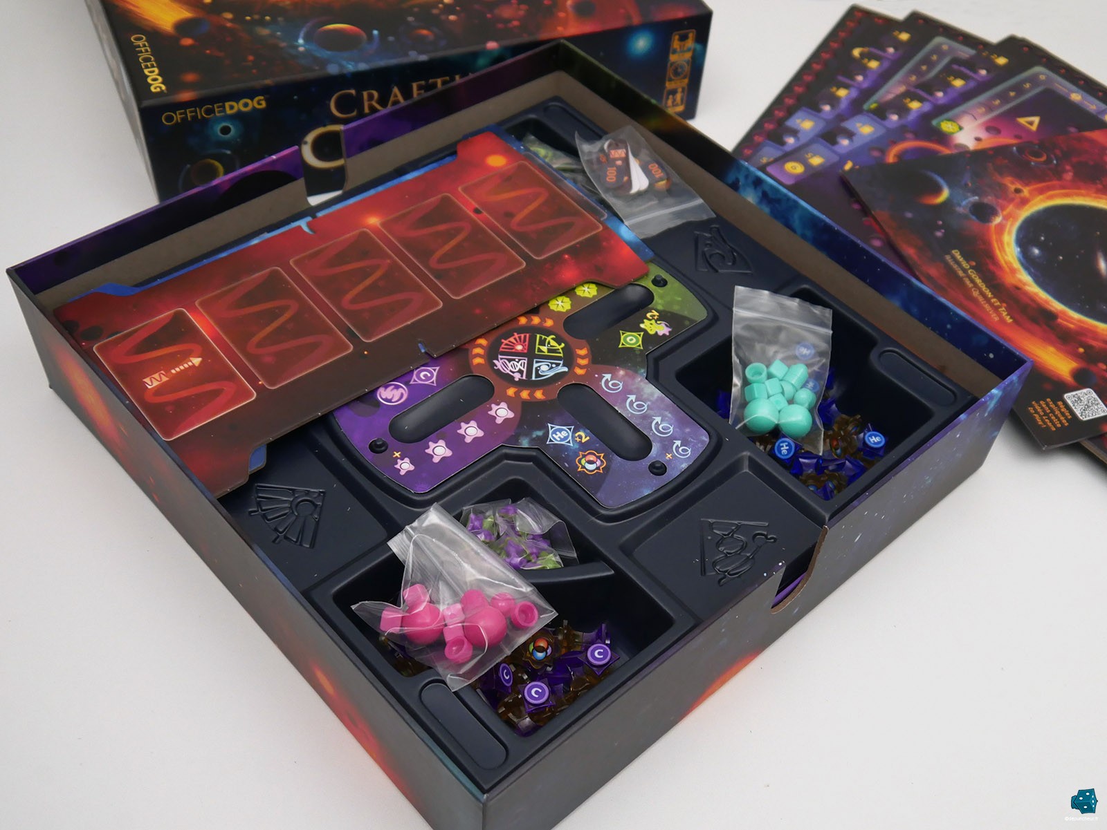 Que que soit les pions Etoile et Proto-Vie double sens aux formes jamais vues dans un jeu de société, les grosses billes de toutes les couleurs, l'épaisseur folle des plateaux double couches, ... Crafting The Cosmos est autant un grand "kiff" visuel (mais regardez-moi cette couv', boudiou !) que son matériel est un vrai délice à manipuler durant la partie.