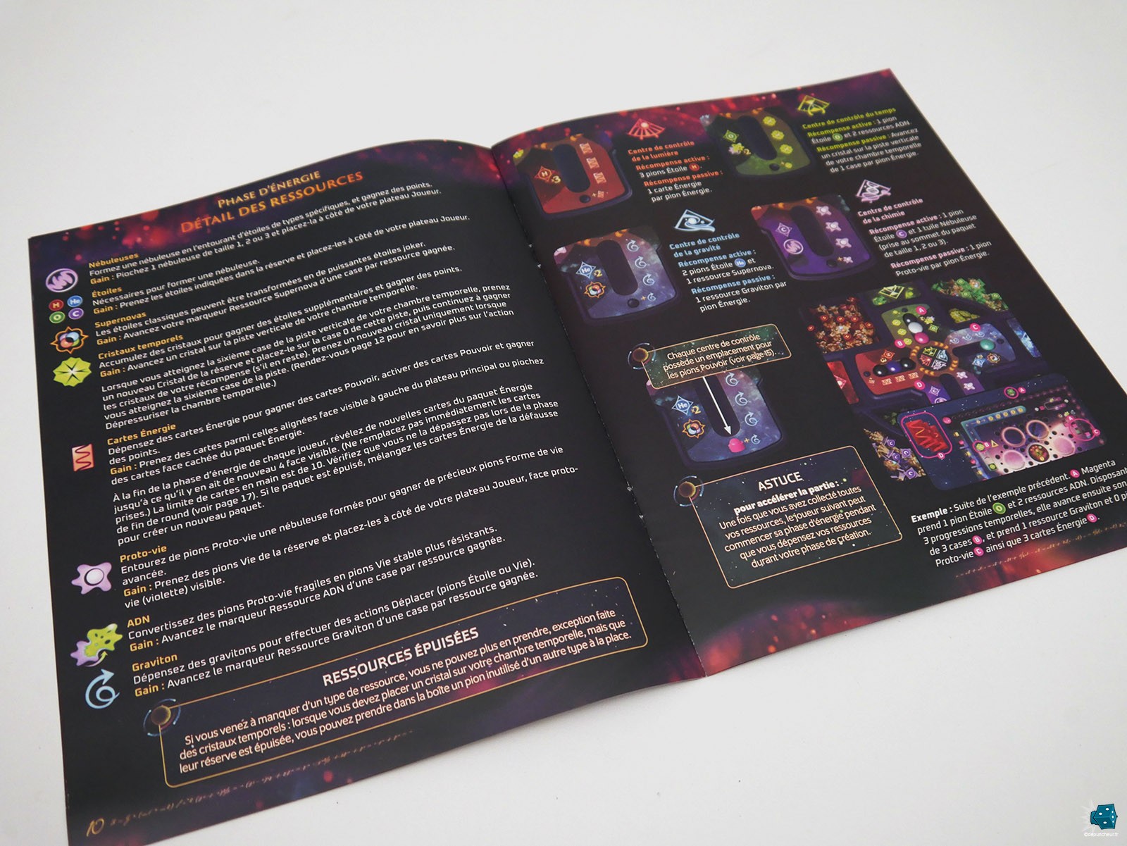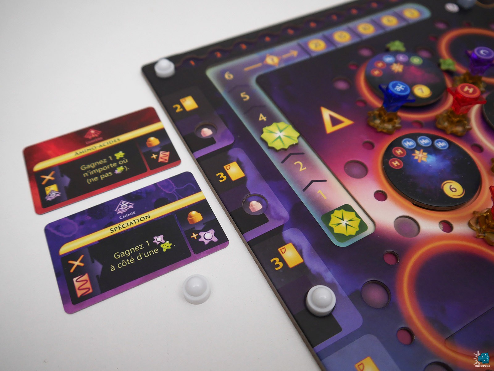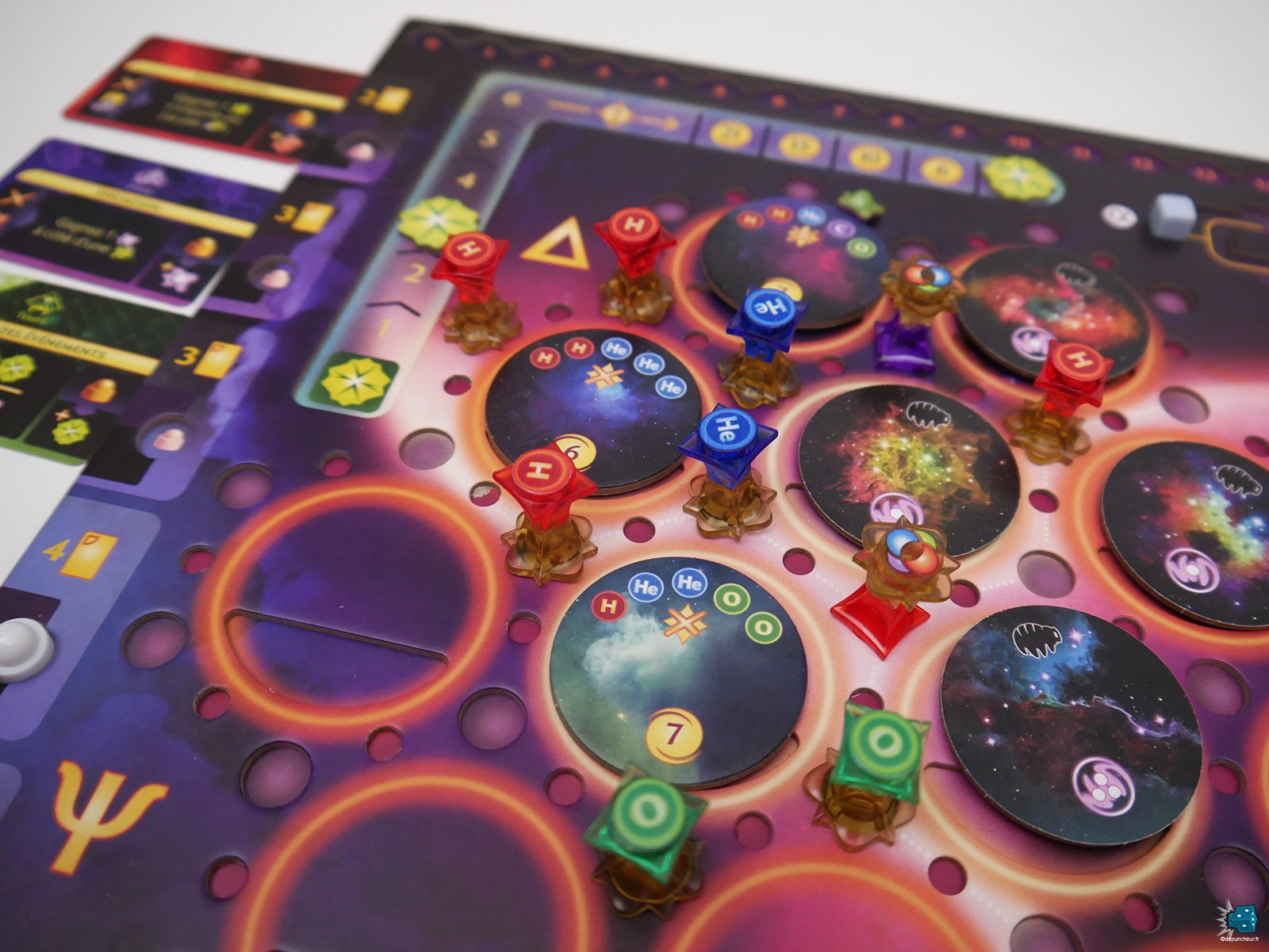 Et les gains sont ici variés. On peut déjà récupérer des pions Etoile (quatre types possibles H, He, O, C), une tuile Nébuleuse, des éléments Proto-vie ou une ressource secondaire (Supernova, Graviton, ADN), toutes devant être utilisées durant la phase suivante pour ne pas les perdre. Il est aussi possible de gagner des cartes Energie, utilisables par la suite pour acheter des cartes Pouvoir ou déclencher certaines capacités de ces dernières, ou des cristaux temporels, qui pour chaque sizaine offre un pion Etoile au choix et des points supplémentaires en fin de partie.