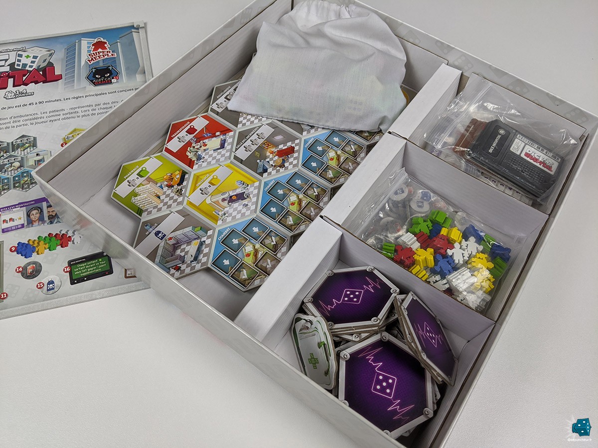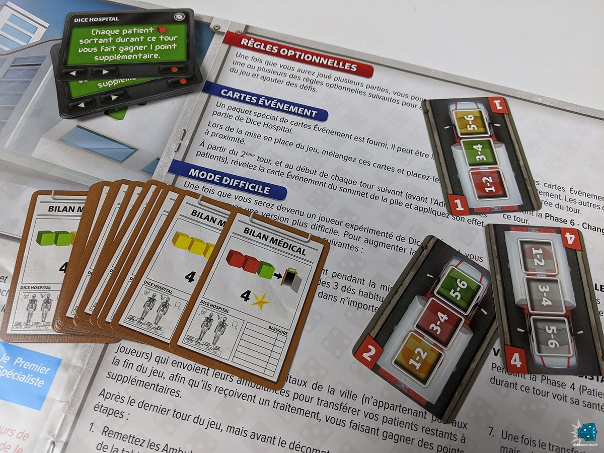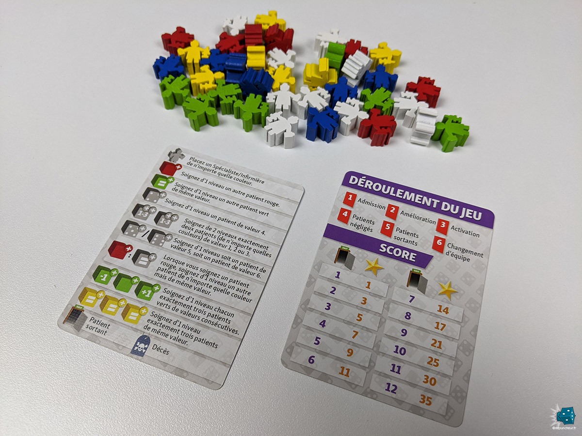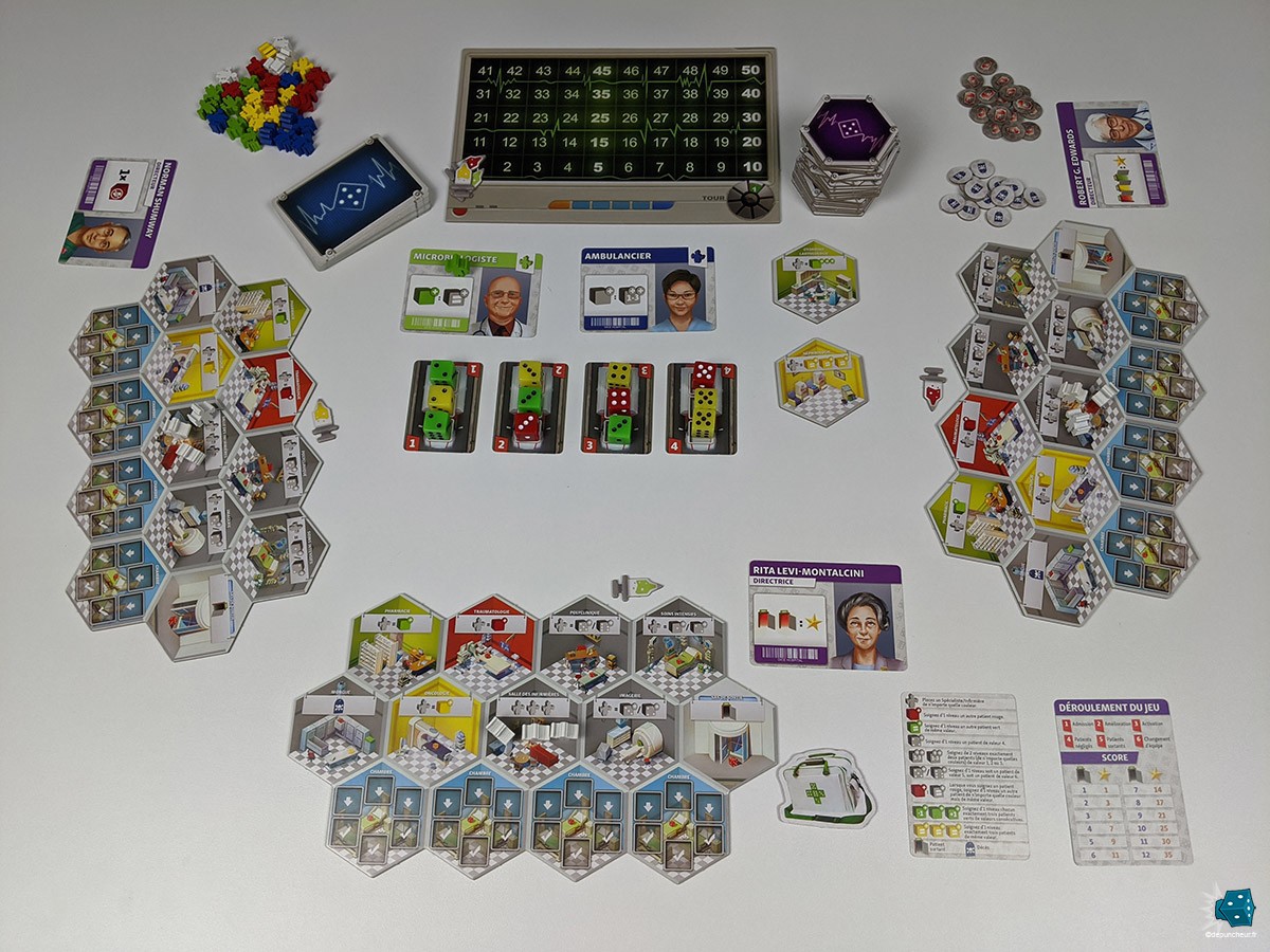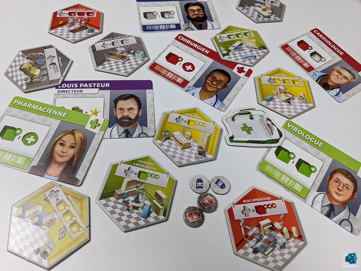 Tous les joueurs débutent avec un plateau hôpital individuel, un directeur d'établissement (une carte objectif offrant des points en cours ou fin de partie) et une équipe composée de trois infirmiers/ères (de jolis meeples blancs).