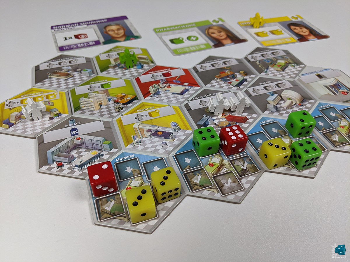 Vous avez l'âme de sauveur du Dr Carter, le sex-appeal du Dr Ross ou le flegme du Dr Benson ? Si c'est un gros oui, banco, vous êtes prêts à rejoindre les équipes de Dice Hospital, un jeu de gestion ... de service hospitalier (surprouiiiise!) mêlant draft de dé et pose d'ouvriers. Par contre si vous avez dit oui, c'est que vous êtes assez vieux pour connaître les références susnommées. Il serait alors peut-être judicieux d'y réserver une chambre, au cas où. Un accident de pantoufle est si vite arrivé...