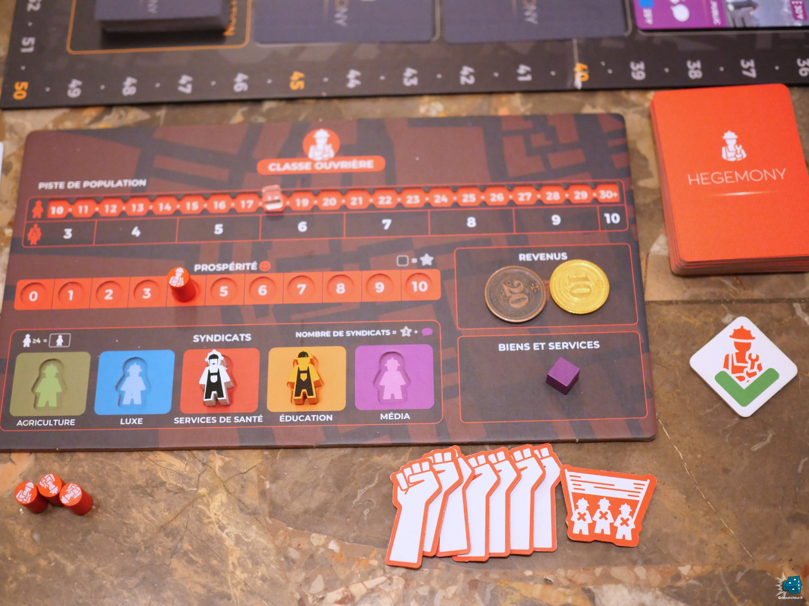 Hegemony est un jeu purement asymétrique (dans la veine de Roots ou Kauri) où chaque joueur va incarner une classe sociale et essayer de la rendre la plus prospère possible. Chaque classe va avoir sa propre façon de jouer et de scorer.