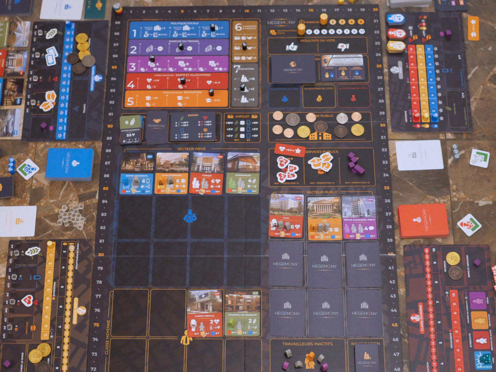 Hégémony réussit une prouesse ludique incroyable : nous plonger dans une simulation socio-économique de la société actuelle pendant 4h de jeu sans que l'on voit le temps passer ! Rarement le gameplay et le thème d'un jeu de société n'ont aussi bien fusionné.