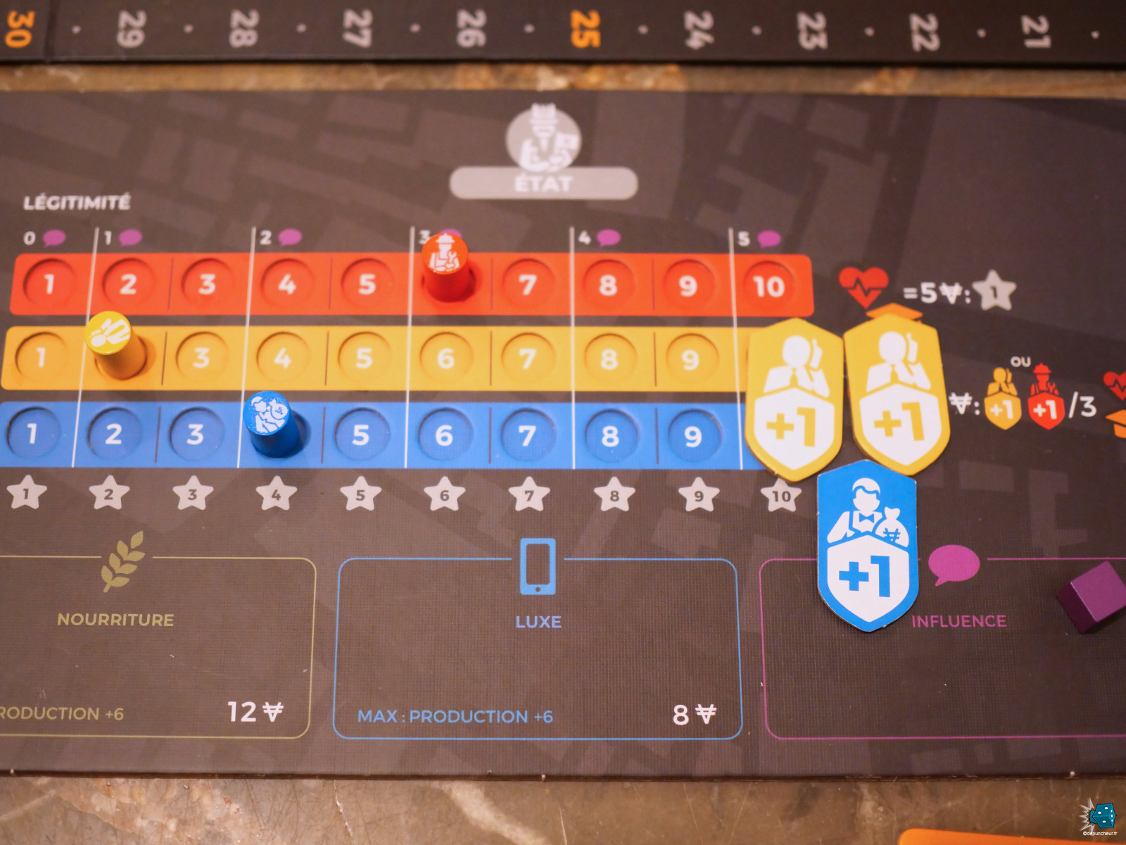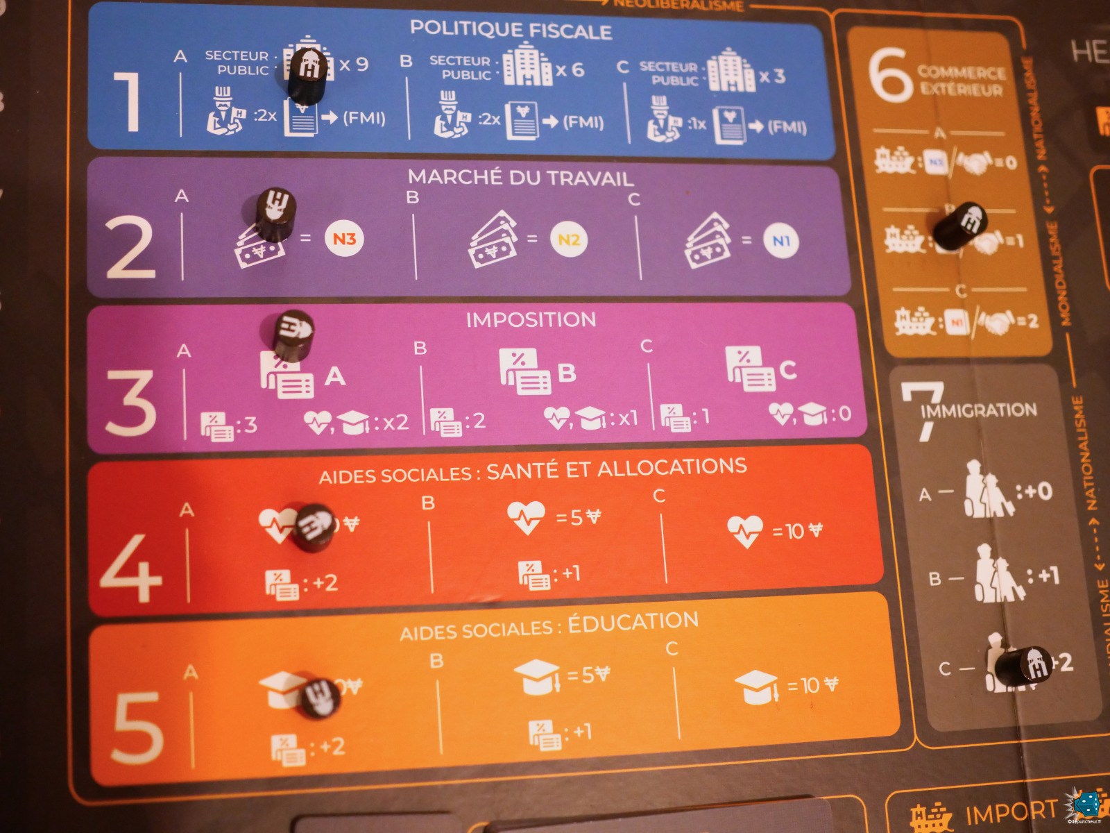 En tête du plateau, se trouve un tableau des politiques divisé en 7 politiques, chacune avec trois positionnements (allant du socialisme au néo-libéralisme pour cinq d'entre elles et du mondialisme au nationalisme pour les deux autres). On y retrouve : La politique fiscale (plus ou moins d'entreprise nationales), le marché du travail (les salaires minimum), l'imposition, les aides sociales : santé et allocation (le coût d'accès aux services de santé public), les aides sociales : éducation (le coût d'accès à l'éducation), le commerce extérieur (les taxes sur l'impôt/export et le nombre de contrats étrangers possibles) et l'immigration (le nombre de nouveaux travailleurs qui vont rejoindre le plateau).