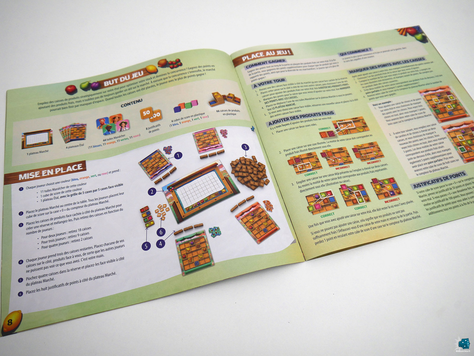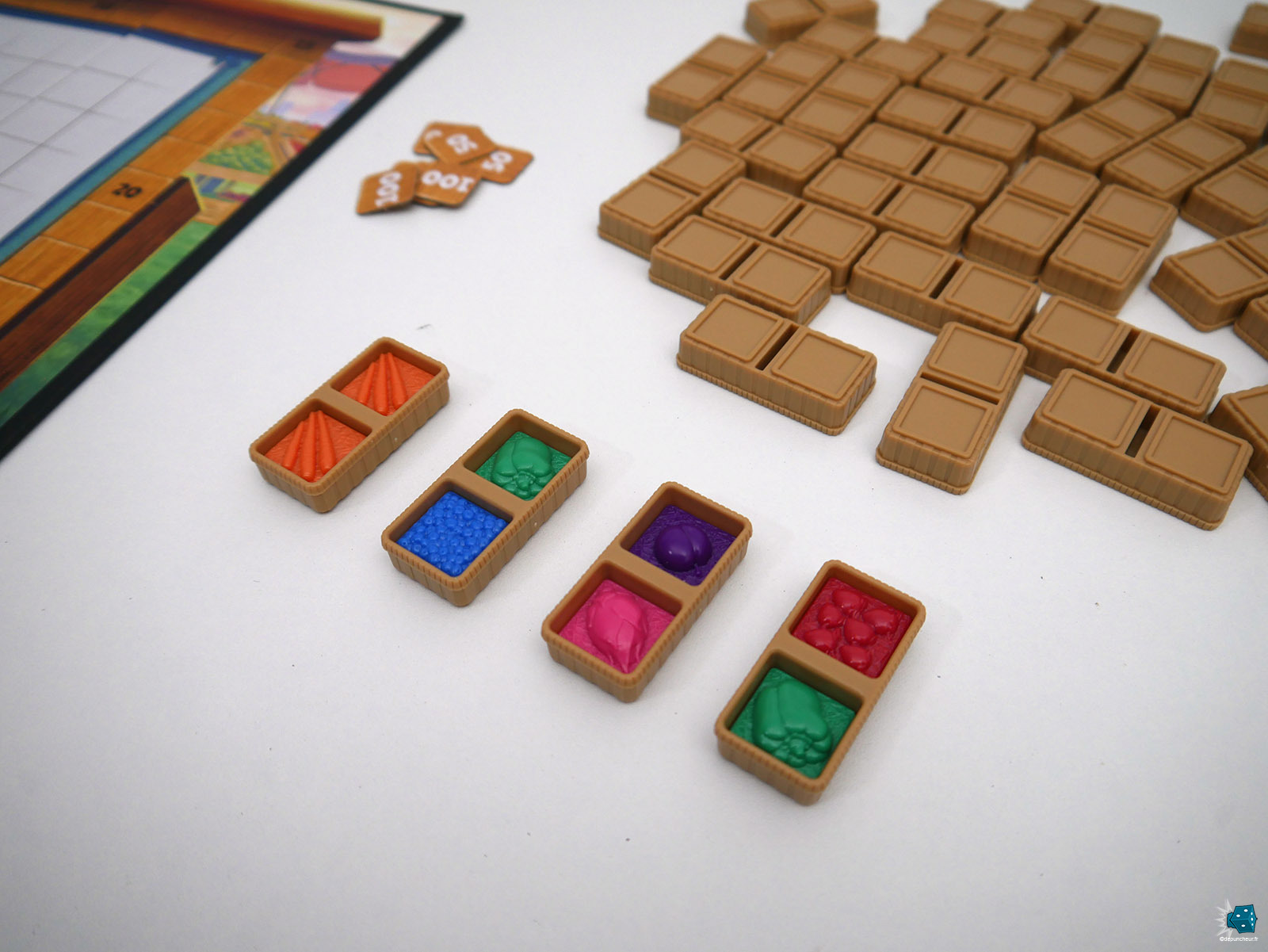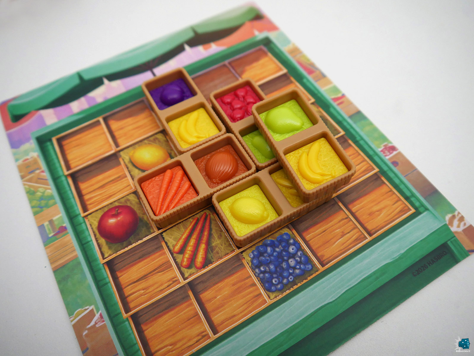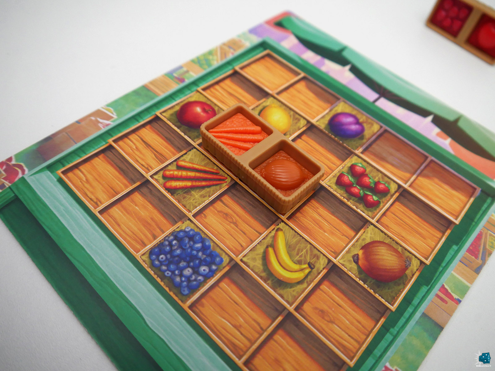 Une fois les éléments à sa couleur récupérés et un côté de plateau individuel choisi, les joueurs doivent saisir, chacun à leur tour, une caisse de la zone centrale et en placer une de leur main sur leur étal. Il faut savoir que chaque caisse a l'allure d'un domino vu du dessus et contient toujours deux aliments parmi onze (banane, pomme, fraises, myrtilles, ciron, poire, oignon, fruit du dragon, poivron, cerise, prune, ...), avec la possibilité d'afficher le même fruit ou légume.