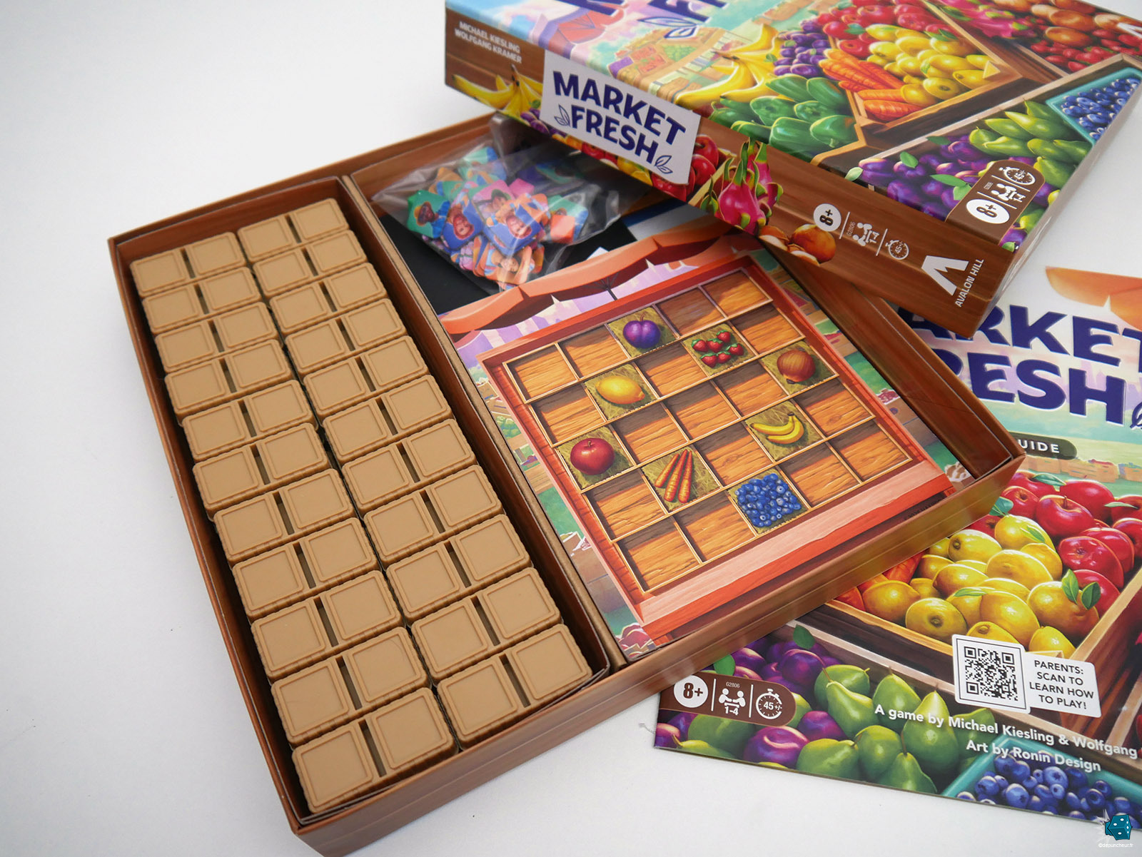 Market Fresh est un jeu de placement et d'empilement de tuiles dans lequel il faut réussir à d'organiser le mieux possible des caisses de produit frais sur notre étal pour remporter des points. Si vous êtes un gros suiveur du marché US, vous trouverez des grandes similitudes avec Jubako (jeu Ravensburger de 2020), avec lequel il partage la base des règles de construction tout en ajoutant un marché central, le tout emballé dans un thème alimentaire plus concret que celui des sushis et makis aux visuels conceptuels du jeu original.