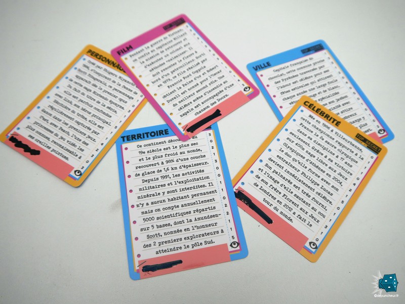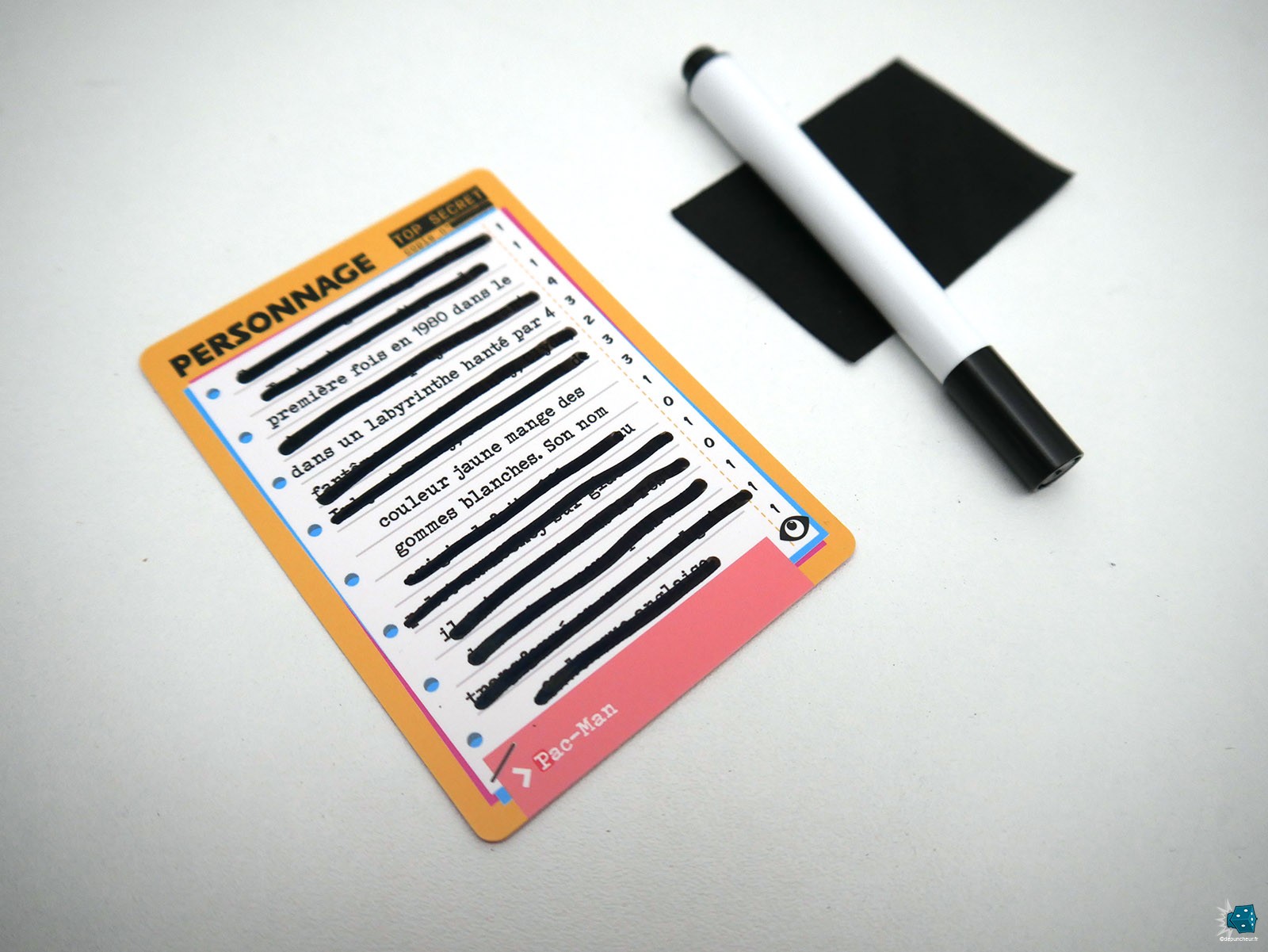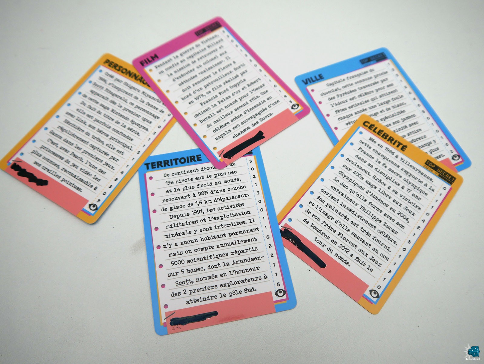 Chaque carte du jeu affiche un texte dont chaque ligne ne correspond pas forcément à une phrase complète, et qui affiche à la fin de chaque rangée un nombre de points Suspicion en adéquation avec la qualité des indices présents dans la ligne. C'est plus simple de faire deviner Strangers Things en conservant des morceaux de phrases incluant Netflix et Wynona Ryder plutôt que ville fictive de l'Indiana, mais cela coûtera forcément plus cher en points !