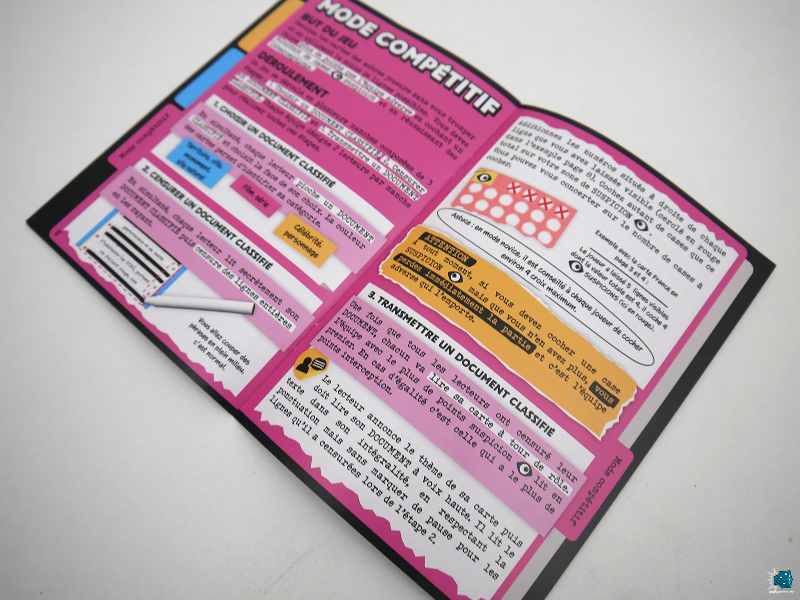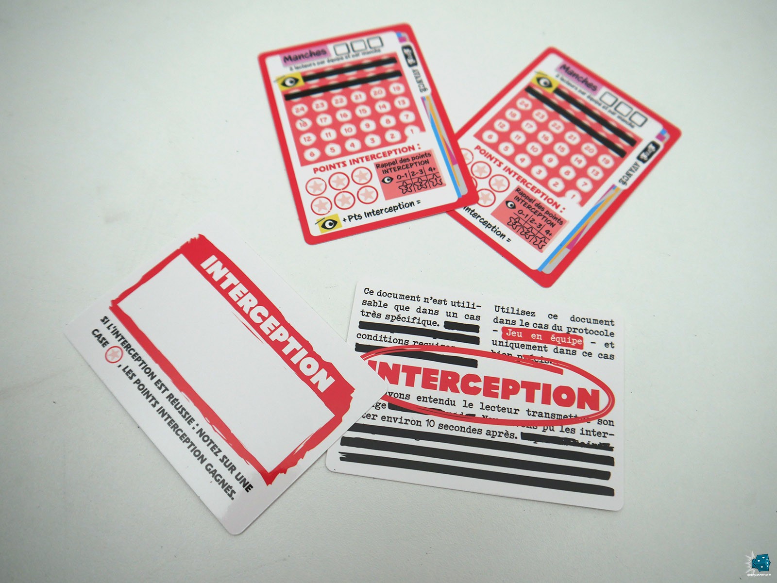Reste qu'Opération Zèbre peut aussi être joué en mode compétitif, par équipes. On est sur la même base de règle, à ceci-près que lorsqu'un joueur lit son document à destination de ses coéquipiers, l'équipe adverse a 10 secondes maximum pour tenter de le deviner et indiquer sa réponse sur sa carte Interception. Cette carte est révélée dès que l'équipe active a fait sa proposition. En cas de réussite, des points supplémentaires sont accordés à l'équipe adverse en fin de partie, en fonction du nombre de points Suspicion utilisés par l'équipe active !