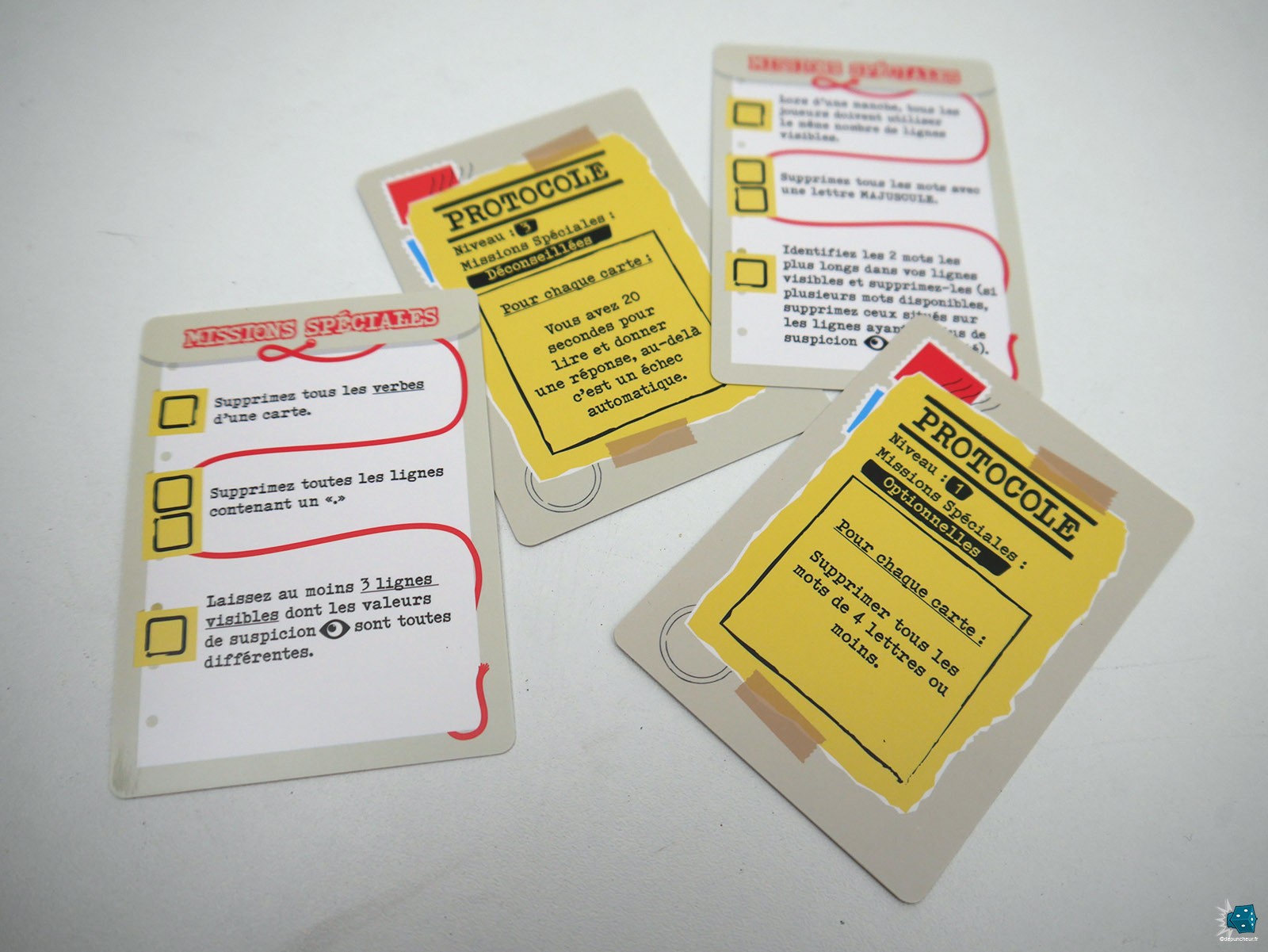 À savoir que dans ce mode, les joueurs peuvent à tout moment demander des indices, comme la première lettre du mot à deviner ou une phrase supplémentaire. Mais tout cela à un coût en points Suspicion, et les joueurs ne peuvent faire qu'une et une seule proposition commune qui, si elle s'avère inexacte, les obligent à tirer une carte Echec provoquant aléatoirement une perte de points Suspicion supplémentaire.