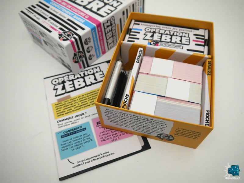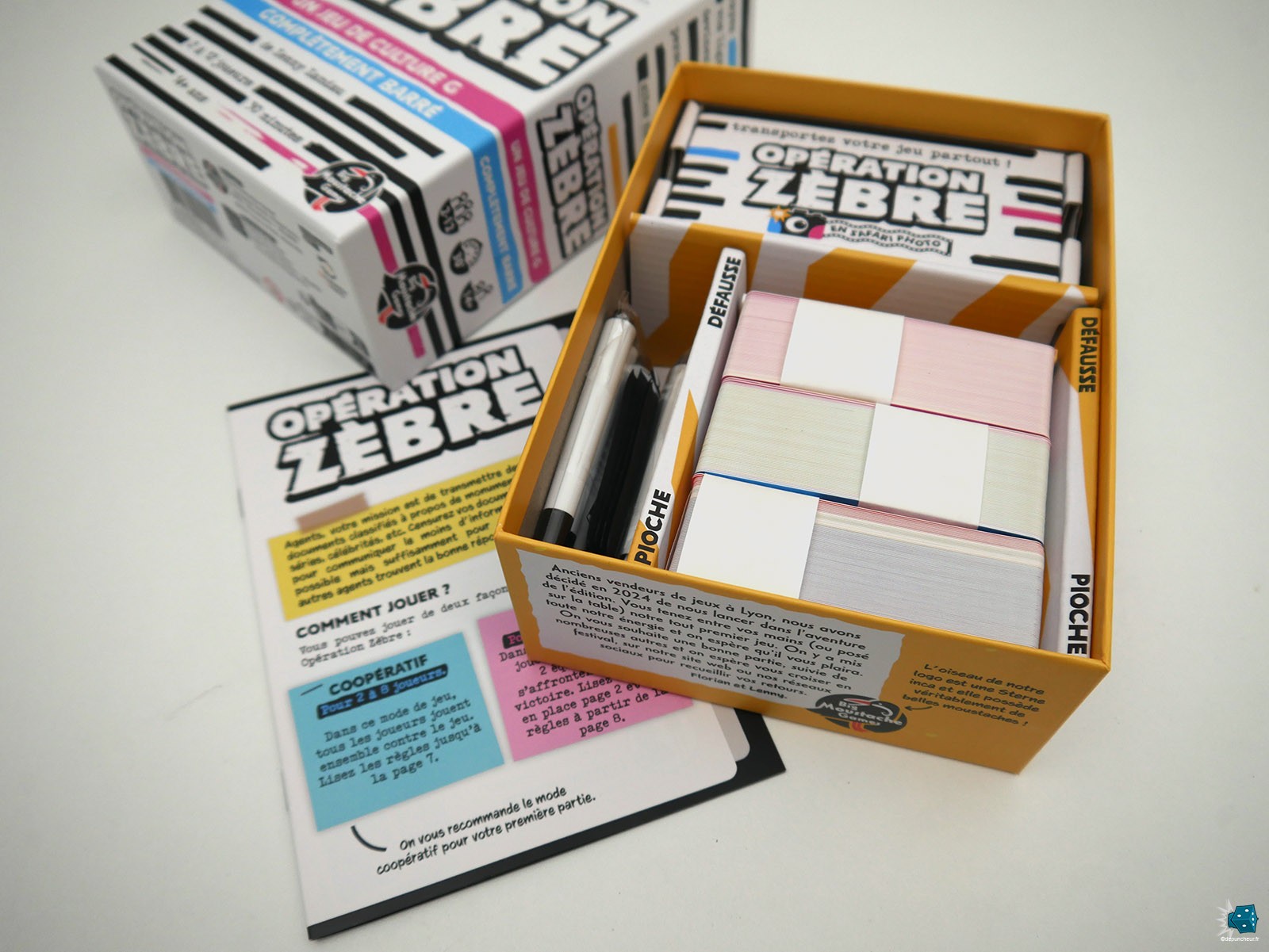 Opération Zèbre est un jeu de culture générale dans lequel il va falloir faire deviner un mot en censurant un maximum de lignes de son descriptif secret pour utiliser le moins possible de points Suspicion.