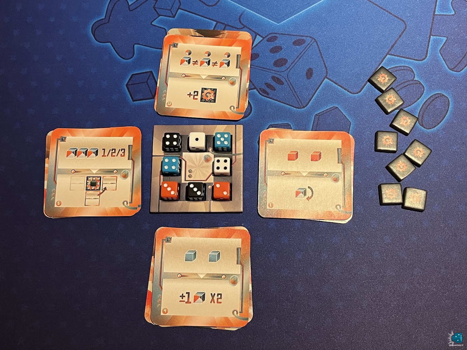Une fois la boite ouverte, il vous suffit de placer le petit plateau carré et de jeter les 8 dés (1 paire de dés de 4 couleurs différentes). Positionnez-les ensuite, au hasard, un à un sur les 4 cotés du carré puis posez face cachée 16 cartes rouages de chaque côté (4 paquets de 4 cartes). Prenez vos 8 jetons bricolage, retournez la première carte de chaque paquet et c’est déjà parti !