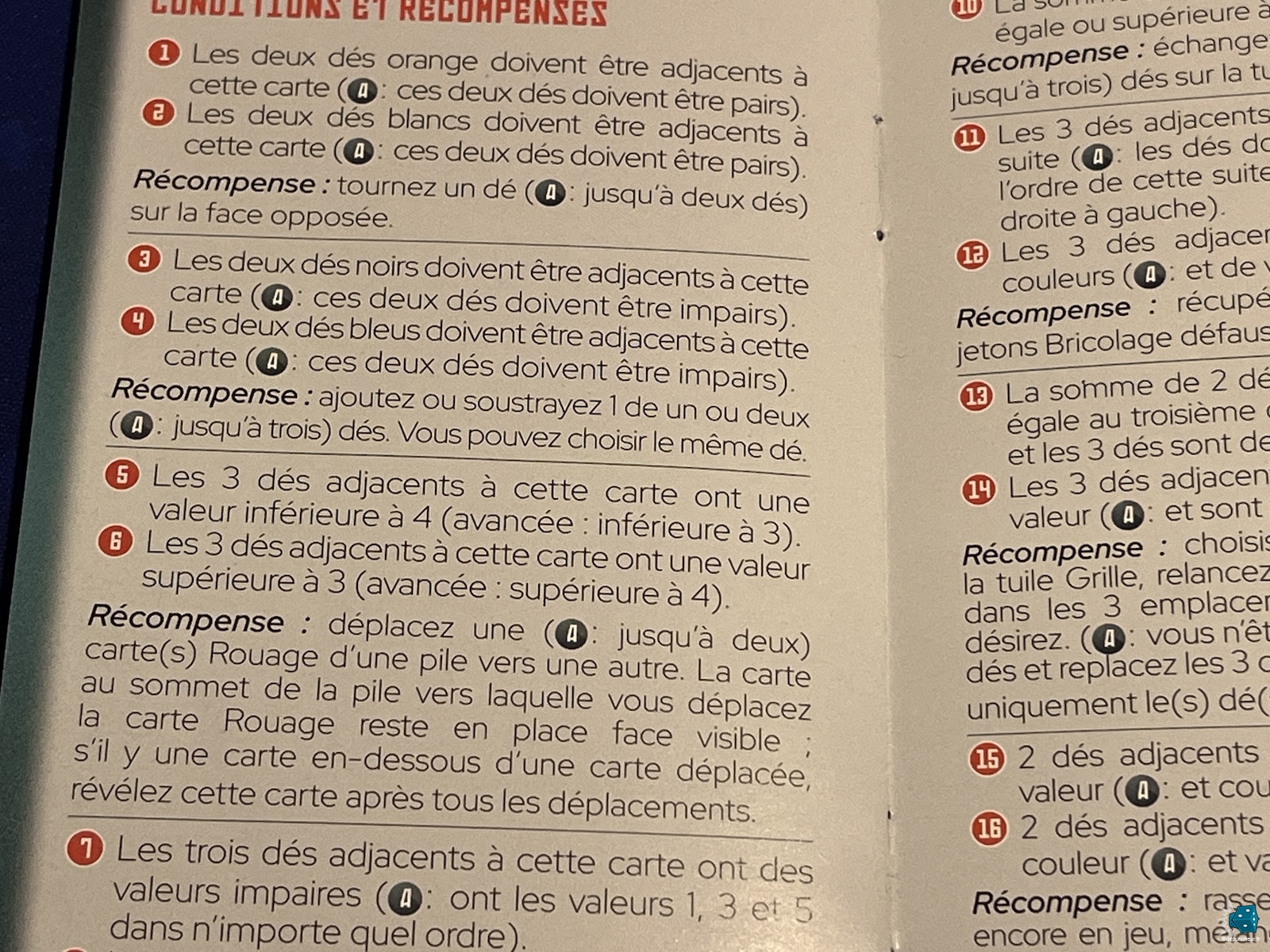 Le livret est relativement clair bien que petit mais j'aurais préféré des pages dédiées aux conditions et récompenses (simples d'un côté, avancés de l'autre) avec un affichage bien plus lisible. Dommage.